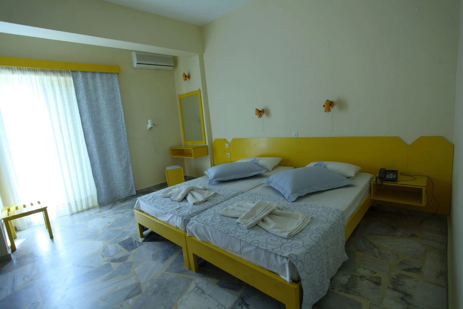 The one-storey beach hotel has 27 rooms, and spread over one main building and one adjoining building. It is equipped with a reception (check-in from 13:00, check-out until 12:00), a lobby, an air conditioning as well as a parking area (for free). WiFi is available for free. Room cleaning is free of charge. Laundry / ironing service is available for a fee. Pool: In the outdoor area of the hotel you will find one fresh water pool with a children´s pool integrated into the main pool. Here, there are sun umbrellas and sun loungers for free available.