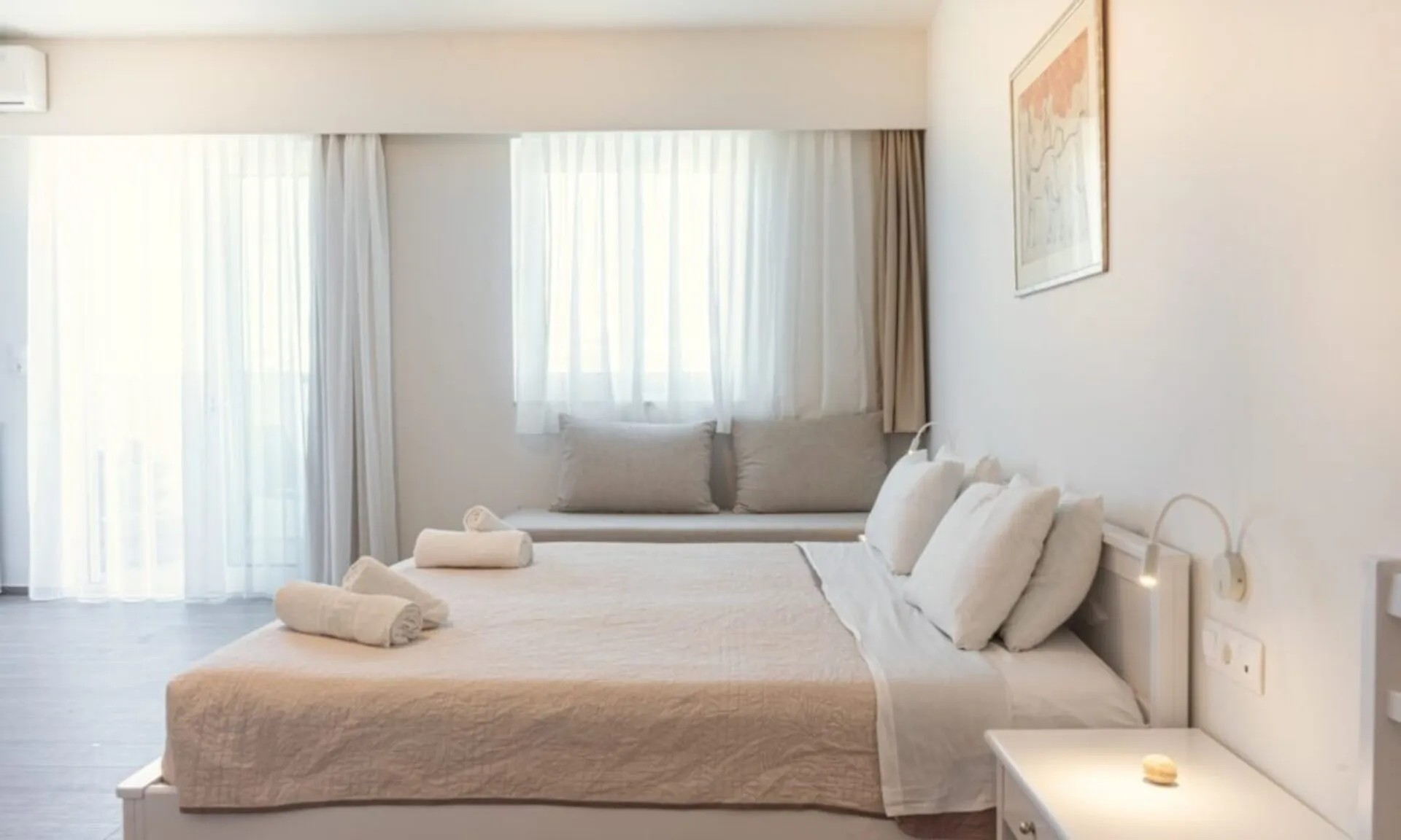 The hotel Thalassi Hotel is approximately 72 km from the airport. The hotel is equipped with a reception, a lobby, Wi-Fi, a supermarket, parking spaces as well as a TV lounge with satellite TV. In the outdoor area of the property you will find a garden as well as a pool that is open seasonally, where sun umbrellas are available for free. Furthermore, outside you can find a terrace. Your valuables can be stored in the hotel safe (extra fee). For the young hotel guests there is a playground. If necessary, you can contact the medical centre (for a fee). The energy supply is 220 Volts. If you want to explore the holiday region, you can use the car rental service close to the hotel (extra fee). Catering Breakfast is offered from the buffet. Your physical well-being is catered for by the pool bar. Distances