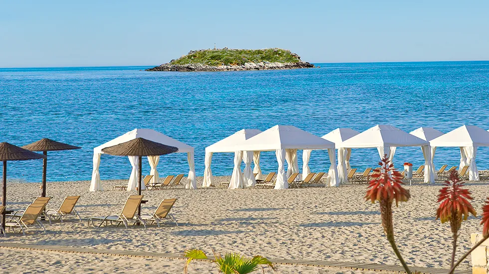 Directly on a sandy-pebbled bay overlooking a tiny island. Try swimming to the private island or walk along the ancient beach to discover the third largest Minoan Palace of Malia.