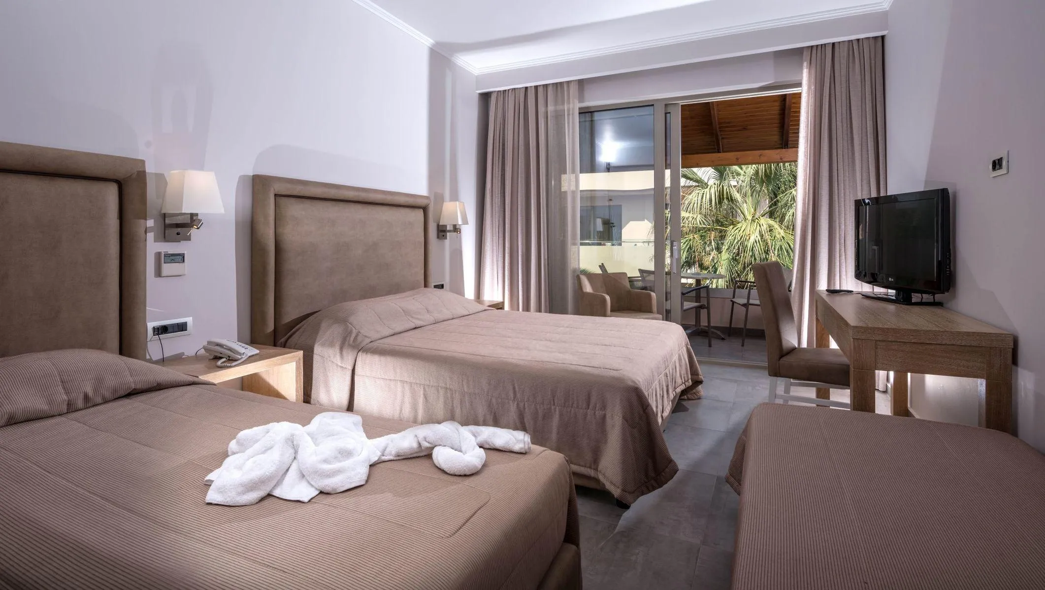 Partially renovated in 2020, the 2-storey resort has 380 rooms, and spread over one main building and 9 adjoining buildings. It is equipped with a reception (check-in from 14:00, check-out until 11:00), a lobby with bar, 3 lifts, an air conditioning, a mini market as well as a parking area (for free). For the meals, there are three restaurants (air-conditioned). In a total 5 bars, you can relax in good company. WiFi is available for free. Room cleaning is free of charge. Medical service (from 09:00 - 09:30) is available for a fee. Pool: In the outdoor area of the hotel, designed in traditional style, you will find 3 fresh water pools with a separate children´s pool. Here, there are sun loungers and sun umbrellas for free available. Refreshing beverages can be consumed directly at the pool bar.