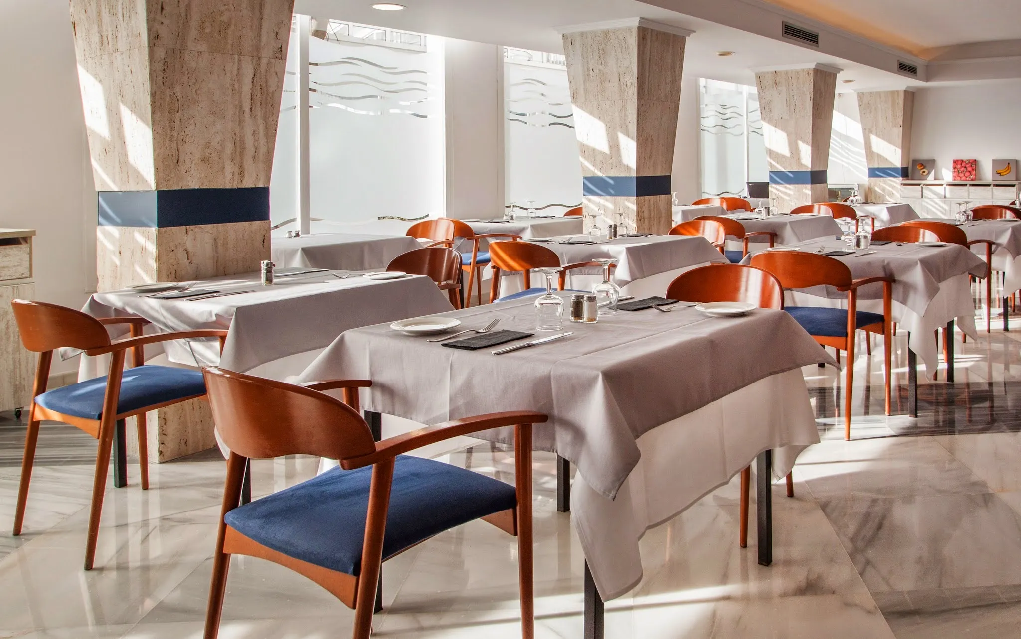 The hotel HOTEL CATALONIA DEL MAR is located approx. 100 m from a beach. The air-conditioned hotel is equipped with a 24h reception, a lobby bar, Wi-Fi, an internet corner, a supermarket, a jacuzzi, parking spaces as well as a TV lounge. In the outdoor area you will find a garden as well as a seasonally open pool, where sun loungers and sun umbrellas are available for free. Furthermore, you can relax outdoors on the sun terrace. Inside the hotel you can use a heated indoor pool. To clean your clothes there is a laundry service. If you want to explore the holiday region, you can use the car rental service close to the hotel (extra fee). Due to its barrier-free facilities , such as barrier-free entrances, the hotel is also suitable for wheelchair users. Catering As catering services the hotel offers half board and breakfast only. Breakfast is offered from the buffet. Dinner is also served as a buffet. For the meals, there are a buffet restaurant with terrace (Mediterranean dishes) and the pool bar. Distances