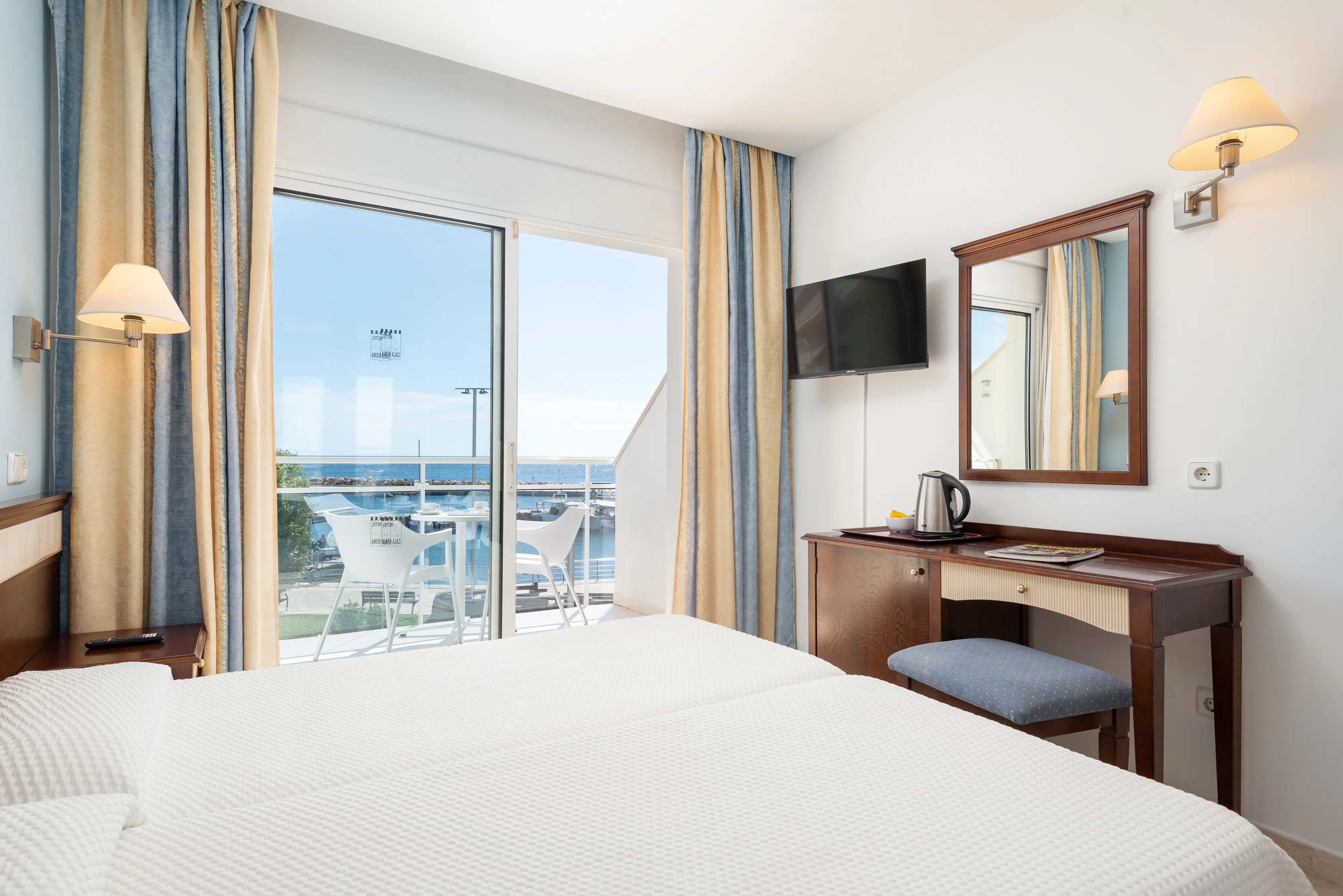 Situated only 60 m from the nearest beach, this hotel enjoys a first-class location in the small fishing harbour of Cala Bona. Various bars, shops and restaurants are to be found in the immediate vicinity. Offering a friendly, home from home atmosphere, this hotel comprises of 5 buildings that are situated around the harbour area. The furthest block lies a mere 150 m from the main building where guests will find Reception, swimmingpool and the dining room. Opened in 1924, partly renovated in 2003, with the last renovation to the bar block in 2011, this complex offers a total of 195 rooms of which selected rooms enjoy views out over the sea. Facilities include an air-conditioned dining room offering international cuisine, a buffet service and "show cooking" We also cater for Special Dietary needs including vegetarian or coeliac. Our main bar with views out over the harbour in day time, features a varied selection of meals and snacks and in the evening drinks and cocktails are also offered while enjoying our evening entertainment. The welcoming rooms come with an en suite bathroom with a shower or bathtub and direct dial telephone (at an extra charge). There is also a fridge (for an additional fee), air conditioning, central heating (both centrally controlled), a TV and a balcony. Some of the rooms have a view of the sea (additional price). Leisure options include a freshwater swimming pool with a separate children's pool and a pool bar. The nearest golf course is some 2 km away. From May till October there is entertainment in our main bar most nights. Guests may select their breakfast and evening meals from ample buffets. Special dietary requirements may be accommodated such as vegetarian and coeliac and we also feature "show cooking". Childrens menus are also available on request. Location:2018 Year of most recent renovation; 195 Total number of rooms; 4 Number of floors (main building); 5 Annexe (s); 4 Number of floors (annexe) Hotel type:hotel Methods of payment:MasterCard; Visa Distances (in meters):Nearest Bus / Metro Stop (4000); Beach (60); Golf course (2000) Room facilities (Standard room):18 Room size (sqm); 1 Number of bedrooms; Living room; Bathroom; Disability-friendly bathroom; Shower; Bathtub; Hairdryer; Wi-fi; Internet access; Direct dial telephone; TV; Fridge; Tea and coffee making facilities ; Centrally regulated air conditioning; Central heating; Balcony; Wheelchair-accessible; Smoking rooms; Extra beds on demand; Cot on demand Facilities:Wheelchair-accessible; Car park; 24-hour reception; Check-in hour; Check-out hour; Wired Internet (Extra Fee); Wi-fi; Airport Shuttle (Extra Fee); Laundry service (Extra Fee); Medical service (Extra Fee); Air conditioning in public areas; Hotel safe (Extra Fee); Currency exchange facilities; Cloakroom; Lift access; Bicycle storage Catering:Café; Bar; Highchairs; Poolside snack bar; Air conditioning in Restaurant Entertainment:Sun loungers; Parasols; TV lounge; Game room Health:Hairdressing salon