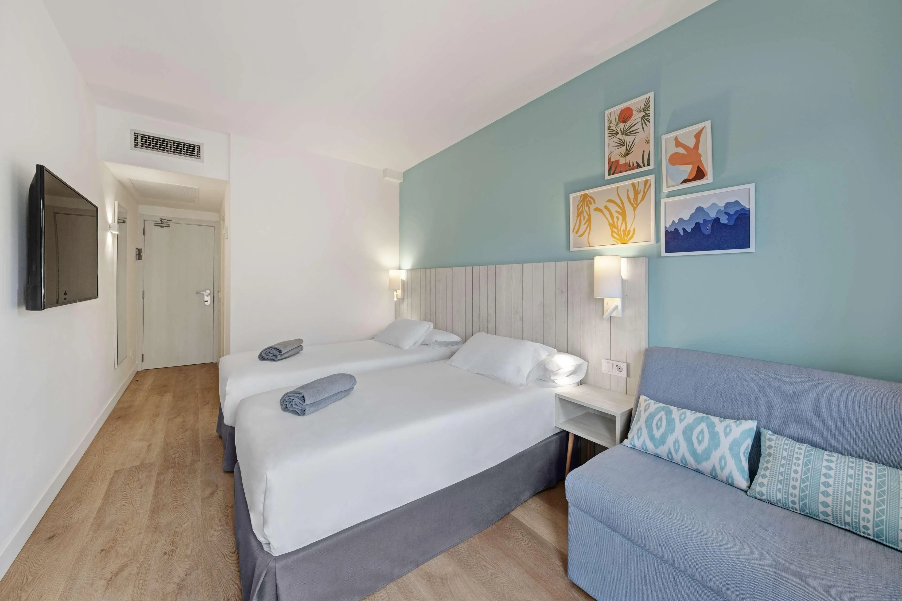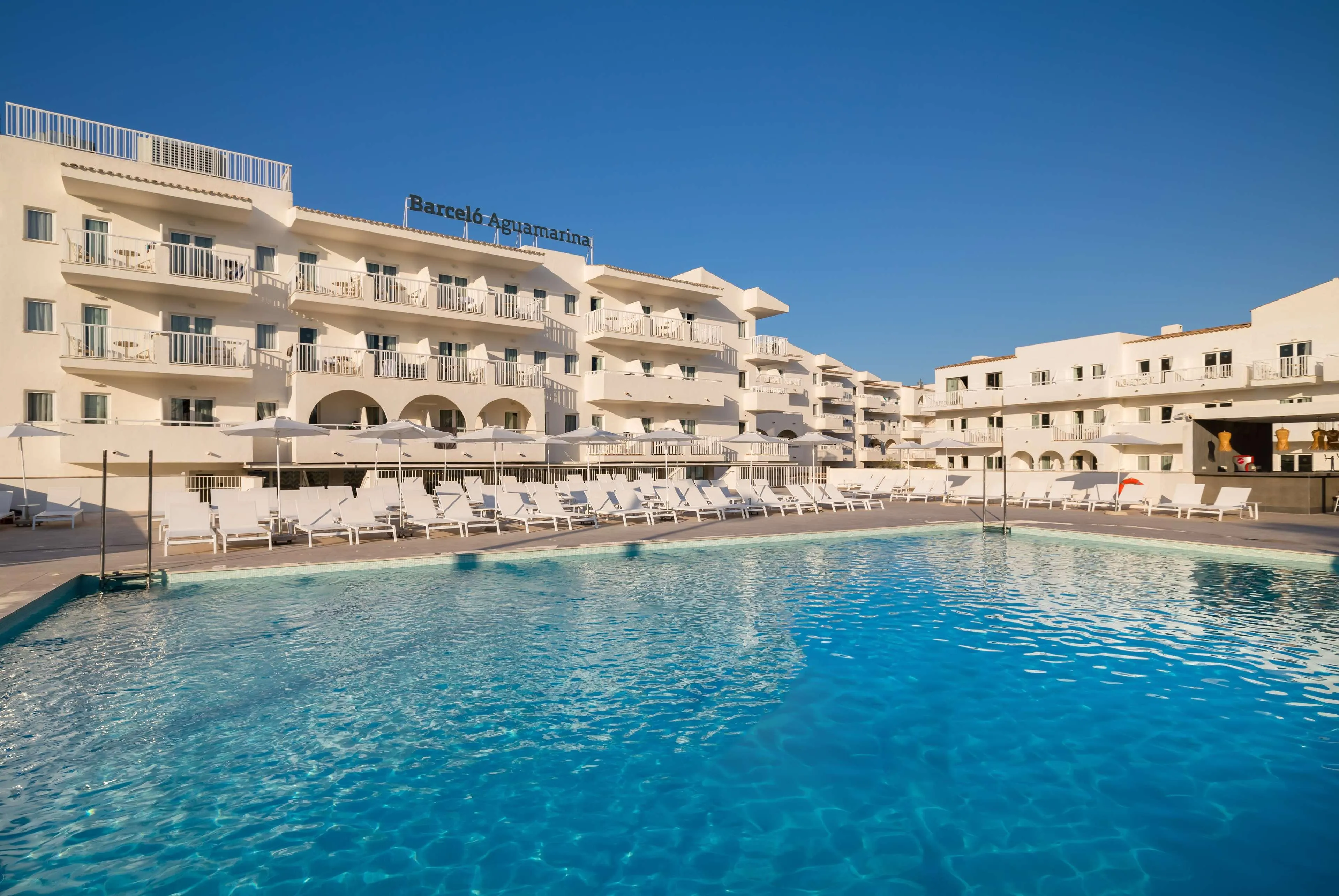 The Barceló Aguamarina hotel is located right on the beach and offers guests direct access to the turquoise waters of Cala Ferrera. Completely refurbished in 2022, this 4-star hotel located in the town of Cala D'Or, one of the main tourist destinations in the southeast of the island of Majorca, is the ideal hotel for a holiday with family, couples or friends, as well as for diving and golf enthusiasts. The hotel has 417 bright rooms fully equipped to guarantee maximum comfort and a welcoming atmosphere during your holiday in Majorca. These include rooms with sea views, rooms with terrace or balcony and connecting rooms perfect for families. In addition to the All Inclusive programme which allows access to a varied gastronomic offer, the Barceló Aguamarina hotel also has the All Inclusive Plus programme which includes, among other services, a selection of unlimited drinks from the best brands, special attention in the rooms, an exclusive area in the buffet restaurant and discounts on the hotel's paid services. We also offer the Half Board service where you will have self-service drinks included with dinner. Guests will enjoy a unique experience thanks to the hotel's facilities and services, highlighting a varied Mediterranean and international cuisine with 2 buffet and à la carte restaurants and a Pool Bar by the pool. The Barceló Aguamarina hotel also has 2 magnificent swimming pools, one of them with spectacular views of the beach and the sea. Location:2002 Year of most recent renovation; 430 Total number of rooms; 8 Number of floors (main building); 42 Single rooms; 388 Double rooms; 4 Suites Hotel type:hotel Methods of payment:American Express; Diners Club; MasterCard; Visa Distances (in meters):City centre (1000); Nearest Bus / Metro Stop (65000); Airport (60000); Beach (10); Golf course (8000) Room facilities (Standard room):Disability-friendly bathroom; Wi-fi; Internet access; Wheelchair-accessible; Smoking rooms; Extra beds on demand; Cot on demand; Shower; Bathtub; Direct dial telephone (Extra Fee); Centrally regulated air conditioning; Housekeeping (Extra Fee) Facilities:Wheelchair-accessible; Car park (Extra Fee); 24-hour reception; Check-in hour; Check-out hour; Wi-fi (Extra Fee); Car hire (Extra Fee); Room service (Extra Fee); Laundry service; Medical service (Extra Fee); Bicycle hire service (Extra Fee); Babysitting service (Extra Fee); Bellboy service (Extra Fee); Air conditioning in public areas; Hotel safe (Extra Fee); Currency exchange facilities; Lift access; Garden; Terrace; Concierge; Luggage room; Clothes dryer Catering:Café; Bar; Restaurant; Poolside snack bar; Air conditioning in Restaurant Business:Conference room; Meeting room; Business centre Entertainment:1 Indoor freshwater pool; 1 Outdoor freshwater pool; 1 Children’s swimming area; Children playground; Kids’ club; Entertainment programme for adults; Entertainment programme for children; Game room Health:Sauna (Extra Fee); Steam bath; Massage; Spa centre (Extra Fee) Green Programmes - Worldwide:Travelife for Accommodation