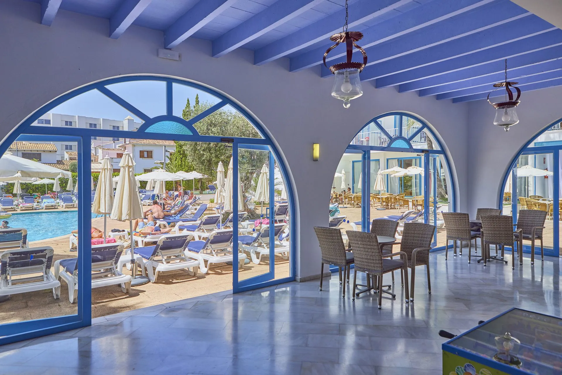 Around 300 m from a beach lies the hotel Ilusion Vista Blava. The air-conditioned hotel is equipped with a lobby bar, 2 lifts as well as showers and changing rooms. Furthermore, you can relax outdoors on the sun terrace. You can store your luggage in the hotel's storage room. There is also a laundry service available at an additional cost to customers. Catering As catering services the hotel offers all-inclusive. Breakfast is offered continental or from the buffet. Lunch and dinner are also served from the buffet. All Inclusive Light includes local alcoholic beverages. Your physical well-being is catered for by a buffet restaurant with terrace (vegetarian dishes). Appropriate clothing is required for lunch and dinner. Distances