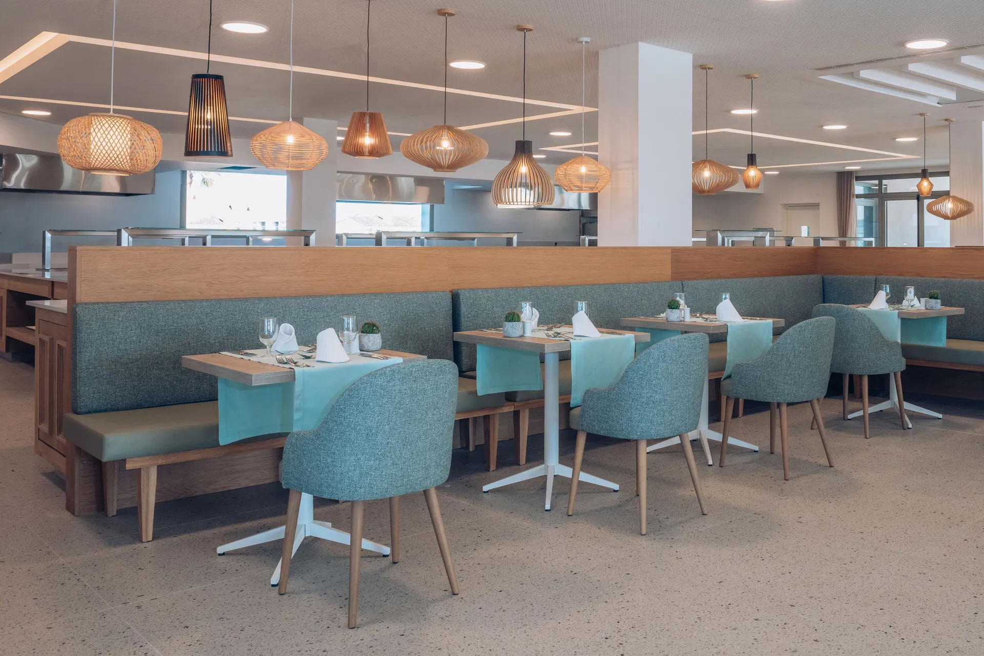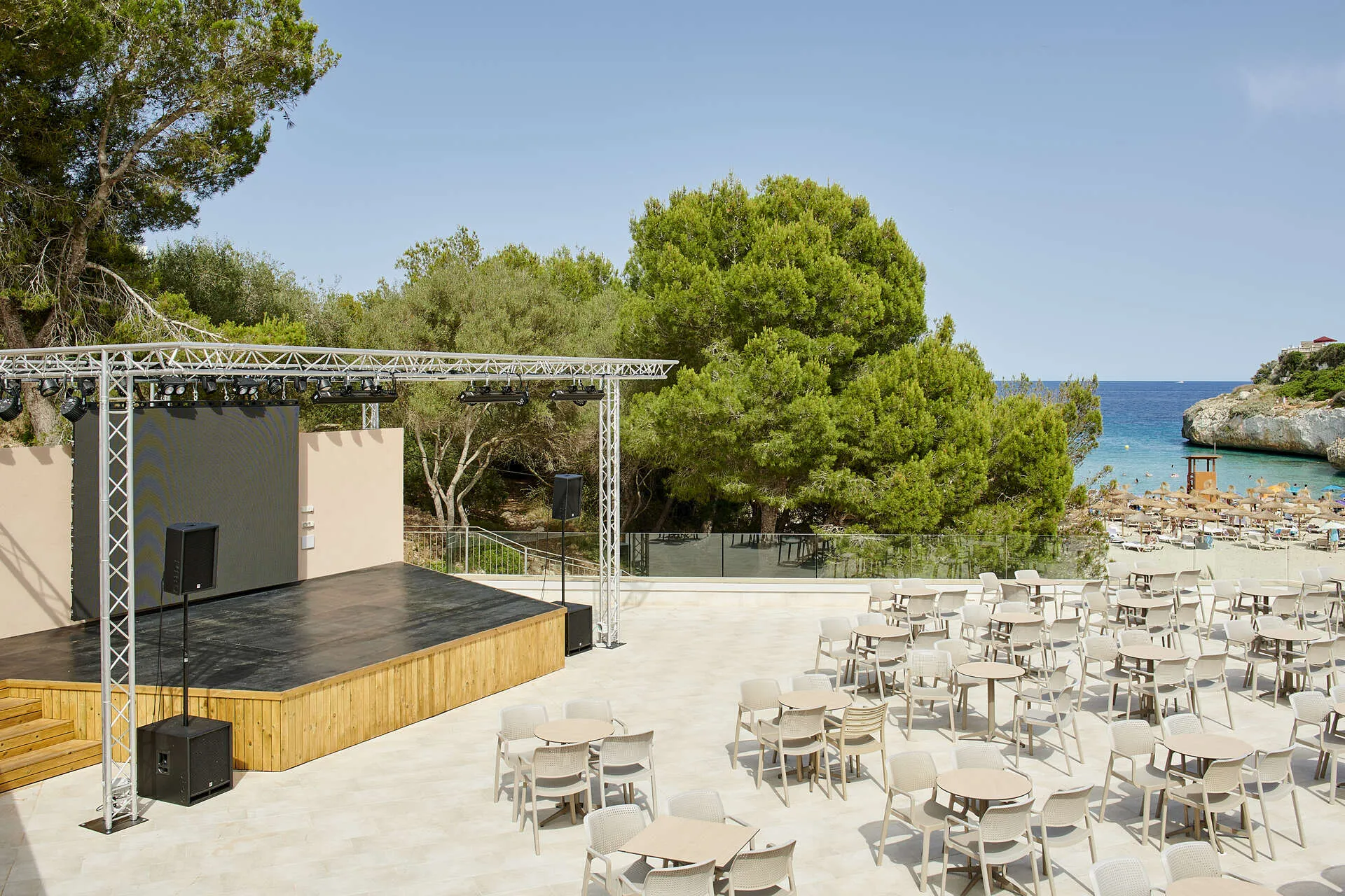 Located in a quiet setting where pine, olive and palm trees create a purely Mediterranean environment, the Iberostar Waves Cala Domingos Hotel offers comfortable accommodation in bungalows with terrace and double rooms offering a wide variety of services, supplemented with world-class public areas that feature a gaming room, children’s entertainment and evening shows, fitness studio and other sports facilities, outdoor pool with sunbathing area and children’s playground, all-inclusive packages, and dining options including a buffet restaurant, a large seaside snack bar, a poolside bar and a lounge bar in the night show and entertainment area.