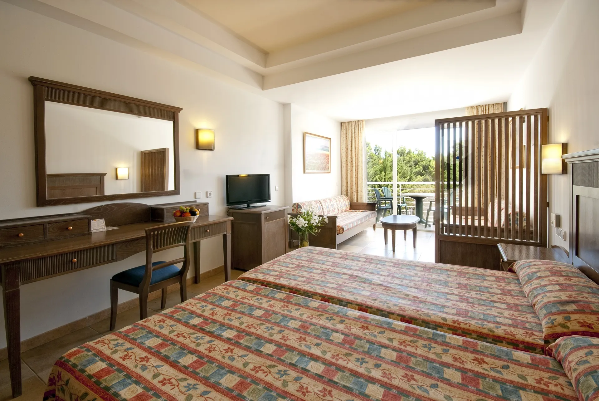 About 50 m from a public sandy/rocky/stone beach is located the hotel Beach Club Font de Sa Cala. The nearest restaurants and bars can be reached in a few minutes on foot. The old town is around 5 km away. Shops are right on your doorstep, a supermarket is around 600 m away. There is a 24h shuttle service between the hotel and the airport (for a fee) 24h a day. The beach is patrolled by a lifeguard. Here, there are sun umbrellas for a fee as well as cushions and beach towels available. Directly next to the beach there is a promenade where you can take leisurely walks. The air-conditioned, GPS-verified hotel is equipped with a 24h reception (check-in is possible around the clock), a lobby bar, Wi-Fi, internet access, 3 lifts, a kiosk, a boutique, cash machine, a hairdresser, showers and changing rooms, a first aid kit, parking spaces as well as a TV lounge with satellite TV. In the outdoor area you will find a garden as well as a seasonally heated and supervised pool that is open seasonally, where sun loungers, sun umbrellas and pool towels are available for free. There are also 3 integrated children's pools with a non-swimming area as well as 4 water slides (type open/tunnel slide). Furthermore, outside you can find a terrace. You can store your valuables in the safe (extra fee), and your luggage in the hotel`s storage room. In addition, the hotel Beach Club Font de Sa Cala is video-monitored 24h a day. For your entertainment, the hotel offers a library/reading room, a theatre and a disco. For the young hotel guests there is a playground. For very young guests, kid`s chairs and cots can also be provided. For the smallest children prams can be rented in the hotel. There is also a laundry and ironing service. For your comfort, in addition to the concierge service the hotel page will ensure you are looked after. If necessary, you can contact the medical centre at any time. The energy supply is 220, 230 and 240 Volts. For conventions and other business meetings, the hotel offers a (auditorium-style) conference area with lectern, tables, a video projector, printer, scanner, overhead projector as well as internet access. A photographer can also be ordered from the hotel for business events. If you want to explore the holiday region, you can use the car and motorbike rental service close to the hotel. At the reception, tickets are offered for excursions in the area. For guests on their honeymoon, the hotel has special offers such as a romantically-decorated room or a present in the room. In your hotel, a lot of focus is placed on sustainability. This includes the hotel`s own recycling bins, the provision of soap and shampoo dispensers and a central room air-conditioning. That is why the hotel Beach Club Font de Sa Cala was also awarded a sustainability certificate. The hotel requires that all guests pay a deposit upon arrival. American Express, Euro/Master Card and Visa are accepted as means of payment. Due to its barrier-free facilities , such as a sliding door in the entrance area, barrier-free entrances, wheelchair accessible rooms, a wheelchair accessible lift, a handrail in the elevator and wheelchair-accessible bathrooms, the hotel is also suitable for wheelchair users. Catering As catering services the hotel offers all-inclusive, all-inclusive light, half board, half board plus, full board and full board plus. Breakfast is offered from the buffet. Enjoy your lunch from the buffet or as a set meal with starters, salads and desserts. Dinner is also served as a buffet, as a set meal or à la carte with starters and salads. Half board includes breakfast and dinner. When booking half board plus, breakfast and lunch are included. For the meals, there are a buffet restaurant with terrace (Italian, Mediterranean, gluten-free and vegetarian dishes) and several bars, the cafeteria as well as the pool bar. The drinks menu of the hotel includes water, soft drinks, beer and wine. A picnic bench can be used by guests for self-catering. Distances
