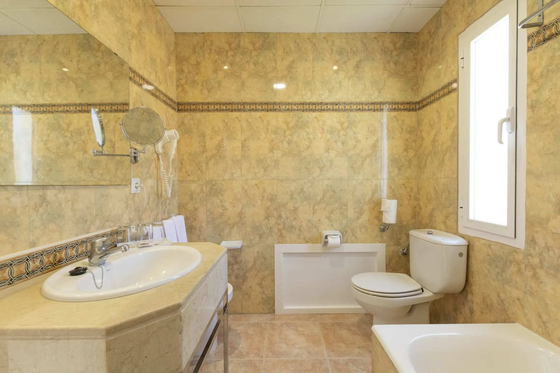 Around 250 m from a beach is located the 4 star accommodation Mar Hotels Paguera & Spa. The hotel is equipped with a 24h reception, a lobby, Wi-Fi, 2 lifts as well as parking spaces (for a fee). In the outdoor area of the property you will find a garden as well as a pool that is open seasonally, where sun loungers are available for free. For children there is also a children's pool. Furthermore, outside you can find a sun terrace. For the young hotel guests there is a playground. You can store your luggage in the hotel's storage room. There is also a laundry service available at an additional cost to customers. For conventions and other business meetings, the hotel offers a conference area. Catering As catering services the hotel offers all-inclusive. Enjoy your lunch from the buffet. Distances