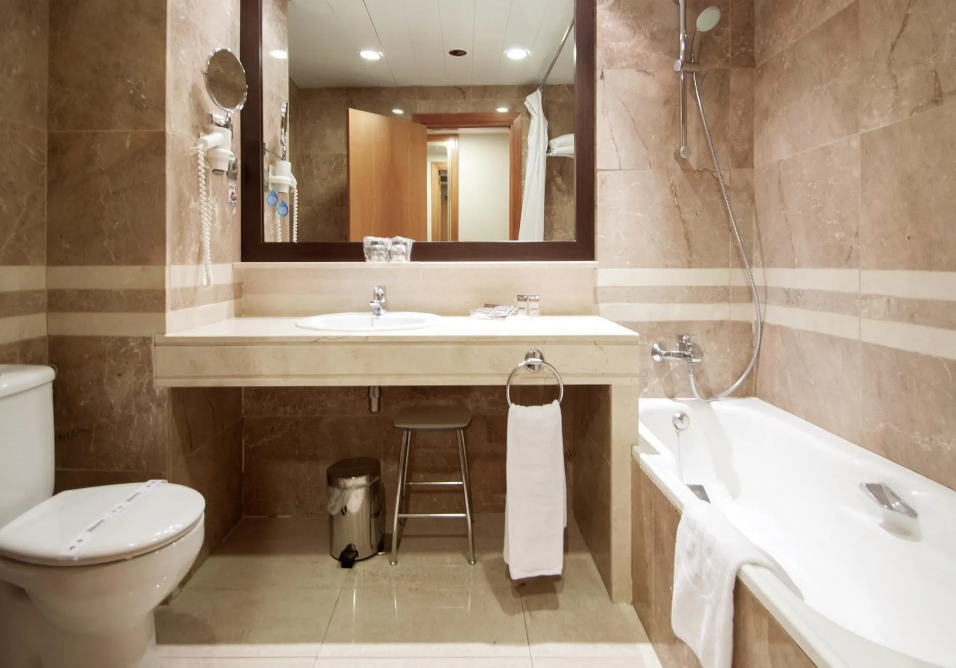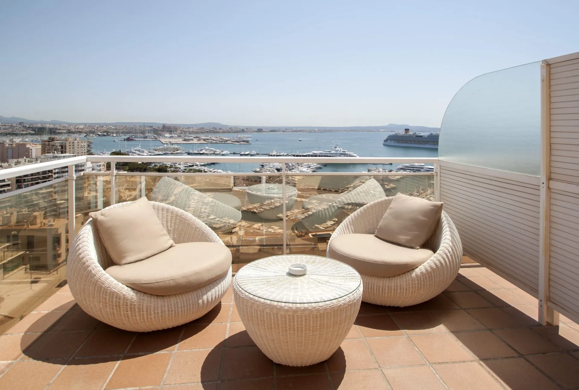 The hotel HOTEL CATALONIA MAJORICA is located approx. 2 km from the old town. The nearest shops you can reach within around 2 km. There is a shuttle service between the hotel and the airport. The air-conditioned hotel is equipped with a 24h reception, Wi-Fi, cash machine, a jacuzzi as well as parking spaces (for a fee). In the outdoor area of the property you will find a seasonally open, heated pool, where sun loungers and sun umbrellas are available for free. Furthermore, outside you can find a sun terrace. Inside the hotel you can use a heated indoor pool. To clean your clothes there is a laundry service. For conventions and other business meetings, the hotel offers a conference area. If you want to explore the holiday region, you can use the car rental service close to the hotel. Pets are allowed (only dogs and cats up to 20 kg, on request). Catering As catering services the hotel offers breakfast only. Breakfast is offered from the buffet. Dinner is also served as a buffet. For the meals, there are a buffet restaurant with terrace and the cafeteria as well as the pool bar. Sports & Leisure For your fitness on holiday, a gym awaits your visit. The wellness area offers massages.
