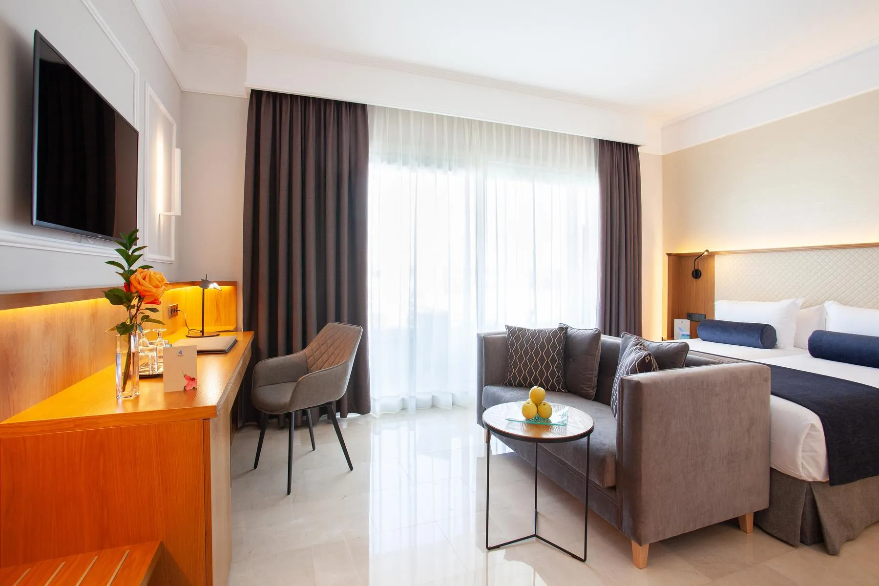 Visa and Euro / MasterCard. Standard Junior Suite (TypeB): The rooms are equipped with twin bed, extra bed (sofa bed), baby cot (for free), tiled floor, minibar (for a fee), balcony or terrace, safe (for a fee) and sat TV as well as centrally controlled air conditioning. Bathroom with shower (room size: 32 m²). Standard Junior Suite (Balcony or Terrace): The rooms are equipped with twin bed, extra bed (sofa bed), baby cot (for free), tiled floor, minibar (for a fee), balcony or terrace, safe (for a fee) and sat TV as well as centrally controlled air conditioning. Bathroom with shower (room size: 32 m²). Standard Junior Suite (PoolView, Balcony or Terrace): The rooms are equipped with twin bed, extra bed (sofa bed), baby cot (for free), tiled floor, minibar (for a fee), balcony or terrace, safe (for a fee) and sat TV as well as centrally controlled air conditioning. Bathroom with shower (room size: 32 m²). SingleUse Standard Junior Suite (Balcony or Terrace): The rooms are equipped with twin bed, extra bed (sofa bed), tiled floor, minibar (for a fee), balcony or terrace, safe (for a fee) and sat TV as well as centrally controlled air conditioning. Bathroom with shower (room size: 32 m²). SingleUse Standard Junior Suite (PoolView, Balcony or Terrace): The rooms are equipped with twin bed, extra bed (sofa bed), tiled floor, minibar (for a fee), balcony or terrace, safe (for a fee) and sat TV as well as centrally controlled air conditioning. Bathroom with shower (room size: 32 m²). Standard Suite: The rooms with living room are equipped with twin bed, extra bed (sofa bed), baby cot (for free), tiled floor, kitchenette, microwave, minibar (for a fee), balcony or terrace, safe (for a fee) and sat TV as well as centrally controlled air conditioning. Bathroom with shower (room size: 40 m²). Standard Suite (Balcony or Terrace): The rooms with living room are equipped with twin bed, extra bed (sofa bed), baby cot (for free), tiled floor, kitchenette, microwave, minibar (for a fee), balcony or terrace, safe (for a fee) and sat TV as well as centrally controlled air conditioning. Bathroom with shower (room size: 40 m²). Standard Suite (PoolView): The rooms with living room are equipped with twin bed, extra bed (sofa bed), baby cot (for free), tiled floor, kitchenette, microwave, minibar (for a fee), balcony or terrace, safe (for a fee) and sat TV as well as centrally controlled air conditioning. Bathroom with shower (room size: 40 m²). Standard Suite (PoolView, Balcony or Terrace): The rooms with living room are equipped with twin bed, extra bed (sofa bed), baby cot (for free), tiled floor, kitchenette, microwave, minibar (for a fee), balcony or terrace, safe (for a fee) and sat TV as well as centrally controlled air conditioning. Bathroom with shower (room size: 40 m²). SingleUse Standard Suite (Balcony or Terrace): The rooms with living room are equipped with twin bed, extra bed (sofa bed), tiled floor, kitchenette, microwave, minibar (for a fee), balcony or terrace, safe (for a fee) and sat TV as well as centrally controlled air conditioning. Bathroom with shower (room size: 40 m²). SingleUse Standard Suite (PoolView, Balcony or Terrace): The rooms with living room are equipped with twin bed, extra bed (sofa bed), tiled floor, kitchenette, microwave, minibar (for a fee), balcony or terrace, safe (for a fee) and sat TV as well as centrally controlled air conditioning. Bathroom with shower (room size: 40 m²).
