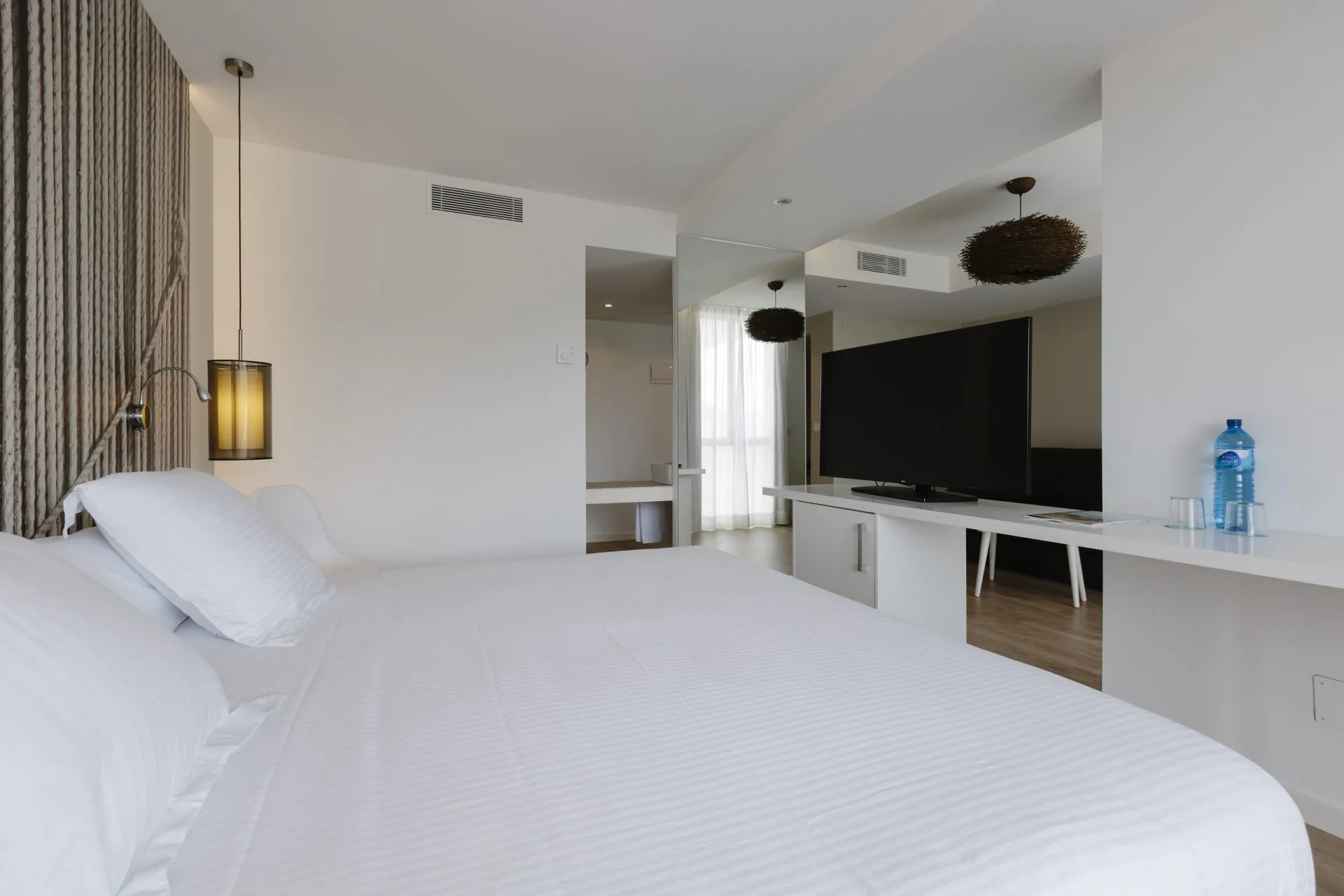 About 800 m from a beach lies the hotel Bordoy Alcudia Bay. The nearest bars and restaurants can be found at a distance of around 100 m. The old town is around 4 km away. The nearest shops you can reach within around 800 m, a supermarket is around 150 m away. Nearby there is a waterpark which offers entertainment in high season. The seasonally air-conditioned, GPS-verified hotel has a 24h reception (check-in is possible around the clock), a lobby, Wi-Fi, internet access, a lift, a jacuzzi, showers and changing rooms, a first aid kit as well as a TV lounge with satellite TV. In the outdoor area you will find a garden as well as a supervised pool, where sun loungers, sun umbrellas and pool towels are available for free. Furthermore, outside you can find a sun terrace. You can store your valuables in the safe, and your luggage in the hotel`s storage room. There is also a laundry service available at an additional cost to customers as well as an ironing service. For your comfort there is a concierge service. The energy supply is 220 Volts. If you want to explore the holiday region, you can use the car rental service close to the hotel (extra fee). In addition, the hotel sells tickets for excursions. For guests on their honeymoon, the hotel has special offers such as champagne or a basket of fruit in the room. In your hotel, a lot of focus is placed on sustainability. This includes the hotel`s own recycling bins, the provision of soap and shampoo dispensers, organic food, a central room air-conditioning and environmentally-friendly cleaning. That is why the hotel Bordoy Alcudia Bay was also awarded a sustainability certificate. For water may incur extra charges at the hotel. American Express, Euro/Master Card and Visa are accepted as means of payment. Due to its barrier-free facilities , such as a sliding door in the entrance area, a hotel door that can be opened manually, separate, barrier-free entrances, wheelchair accessible rooms, a wheelchair accessible lift, a handrail in the elevator and wheelchair-accessible bathrooms, the hotel is also suitable for wheelchair users. Catering As catering services the hotel offers all-inclusive and half board. Breakfast is offered continental or from the buffet (extras on request). Enjoy your lunch from the buffet or à la carte with starters, salads and desserts (extras on request). Dinner is also served as a buffet with starters, salads and desserts. Half board includes breakfast and dinner. When booking all-inclusive, one meal in the à la carte restaurant is included. As part of the all-inclusive service, international alcoholic beverages (unlimited) as well as international alcoholic beverages (limited) are available at no extra charge. For the meals, there are a buffet restaurant (Mediterranean, gluten-free and vegetarian dishes) and the cafeteria as well as the pool bar. The drinks menu of the hotel includes water, soft drinks, coffee and tea, beer and wine. Appropriate clothing is required for lunch and dinner. Distances