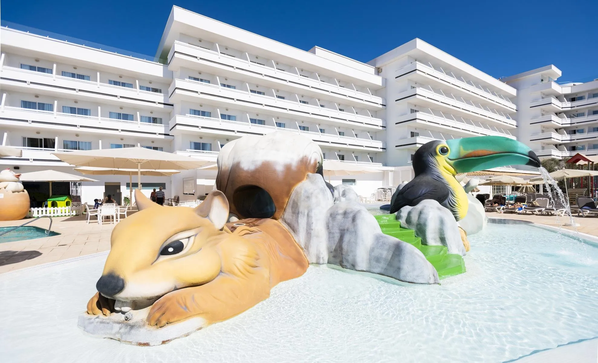 Partially renovated in 2021, the 5-storey beach hotel has 466 rooms. It is equipped with a 24h reception (check-in from 14:00, check-out until 11:00), a lobby, 4 lifts, an air conditioning, a mini market, a money changing facility as well as a sky bar. For the meals, there are two restaurants (air-conditioned) and a snack bar. In a total 3 bars, you can relax in good company. WiFi is available for free. Room service, laundry / ironing service and medical service are available for a fee. Pool: In the outdoor area of the mediterranean-style hotel you will find 2 fresh water pools with a separate children´s pool (open from June to September). Here, there are sun loungers and sun umbrellas for free available. Refreshing beverages can be consumed directly at the pool bar (open from 10:00 - 18:00).