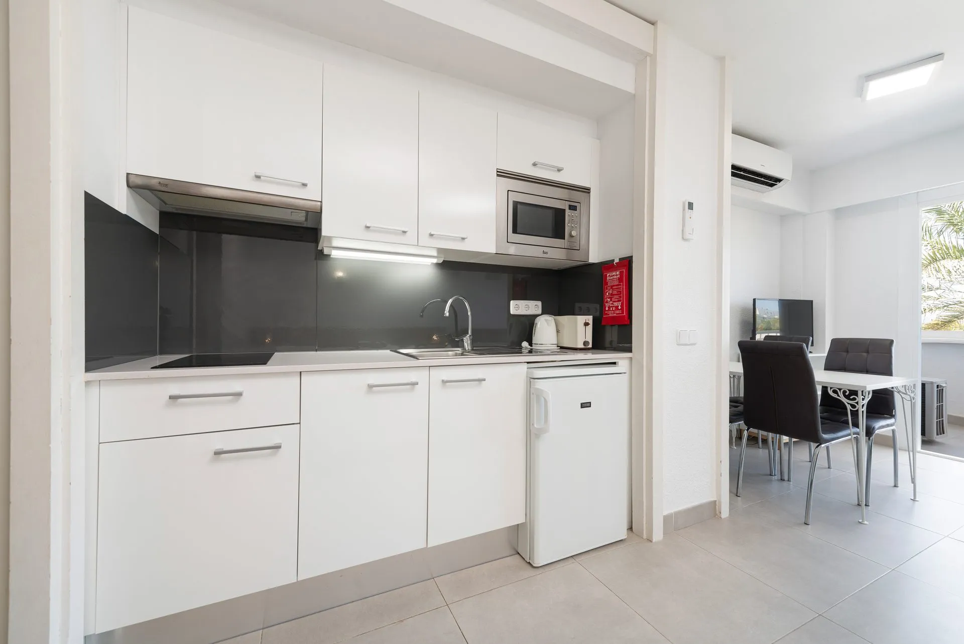 About 900 m from a public sandy beach is located the accommodation Apartamentos Siesta I. The old town is around 5 km away. The nearest shops you can reach within around 2 km, a supermarket is around 500 m away. The beach is awarded a blue flag, pets are allowed. Near the beach there is a promenade where you can go for a stroll. The air-conditioned, GPS-verified hotel has a 24h reception (check-in is possible around the clock), a lobby, Wi-Fi, internet access, 3 lifts, showers and changing rooms, a first aid kit as well as a TV lounge with satellite TV. In the outdoor area of the property you will find a garden as well as a pool that is open seasonally, where sun loungers and sun umbrellas are available for free. For children there is also a separate children's pool with a non-swimming area, 2 water slides as well as a children`s slide. Furthermore, you can relax outdoors on a terrace. You can store your valuables in the safe, and your luggage in the hotel`s storage room. For your entertainment, the hotel offers a library/reading room. For the young hotel guests there is a playground. For very young guests, kid`s chairs, highchairs and cots can also be provided. For the smallest children prams can be rented in the hotel. There is also a laundry service available at an additional cost to customers as well as an ironing service. For your comfort there is a concierge service. If necessary, you can contact the medical centre at any time (for a fee). Guests at the accommodation can get a wake-up call from the hotel personnel. The energy supply is 220 Volts. If you want to explore the holiday region, you can use the car rental service close to the hotel. At the reception, tickets are offered for excursions in the area. Pets like cats and dogs up to 10 kg are allowed in the hotel (on request). In your hotel, a lot of focus is placed on sustainability. This includes the hotel`s own recycling bins, the provision of soap and shampoo dispensers and a central room air-conditioning. American Express, Euro/Master Card and Visa are accepted as means of payment. Due to its barrier-free facilities , such as barrier-free entrances, wheelchair accessible rooms, a wheelchair accessible lift, a handrail in the elevator and wheelchair-accessible bathrooms, the hotel is also suitable for wheelchair users. Catering As catering services the hotel offers self-catering. Breakfast is offered continental, from the buffet or à la carte (extras on request). Enjoy your lunch as a set meal or à la carte with starters, salads and desserts (extras on request). Dinner is also served à la carte with starters, salads and desserts (extras on request). For the meals, there are a buffet restaurant with terrace (gluten-free and vegetarian dishes) and a bar as well as the cafeteria. The drinks menu of the hotel includes water, soft drinks, coffee and tea, beer and wine. Distances