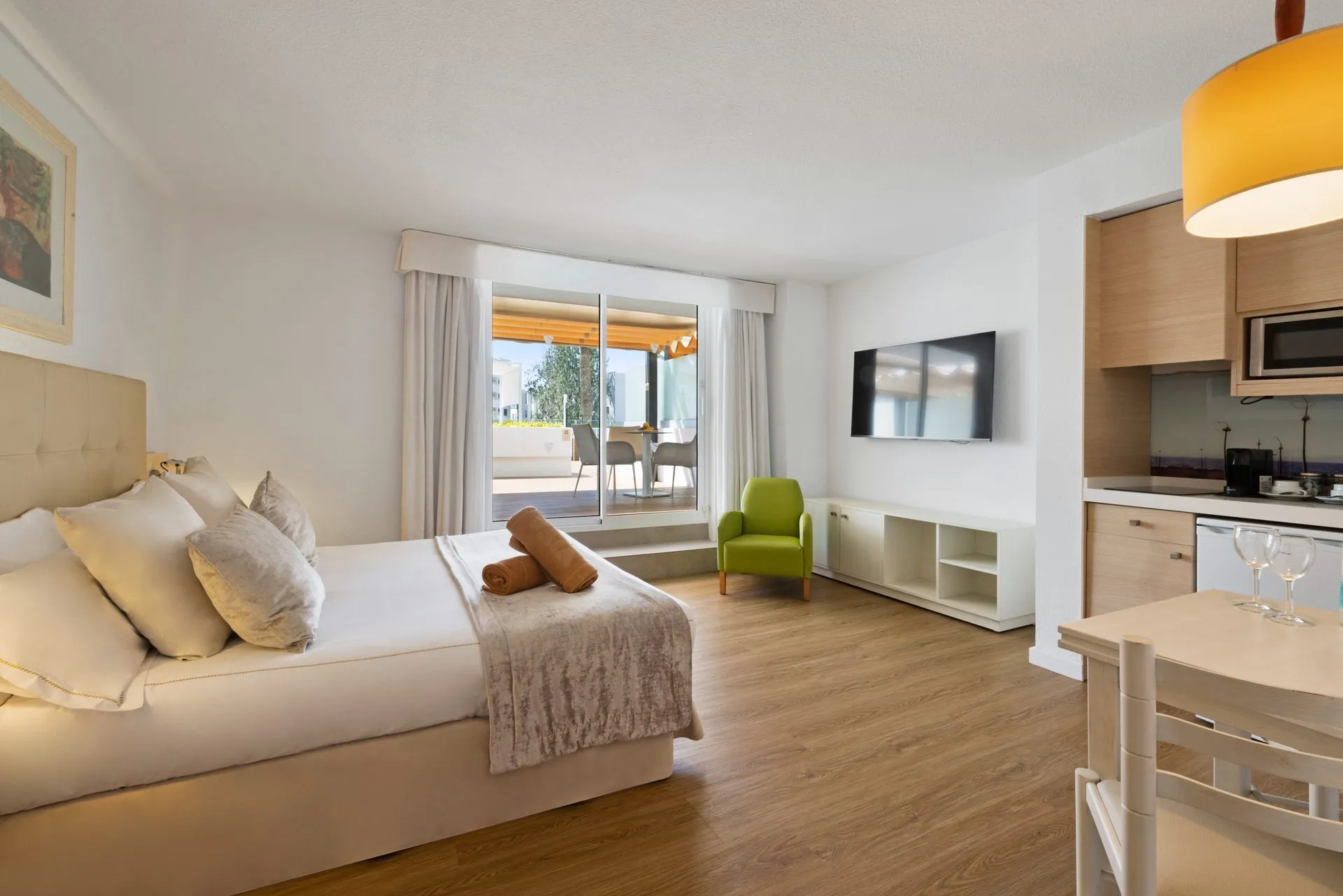 The aparthotel Viva Sunrise is located approximately 400 m from a beach. The hotel is equipped with a 24h reception as well as Wi-Fi. Outside there is a children's pool, where pool towels are available for free. Furthermore, you can relax outdoors in the garden. For the young hotel guests there is a playground. For very young guests, cots can also be provided (for a fee). The energy supply is 220 Volts. If you want to explore the holiday region, you can use the car rental service close to the hotel. Catering Your physical well-being is catered for by a buffet restaurant. Distances
