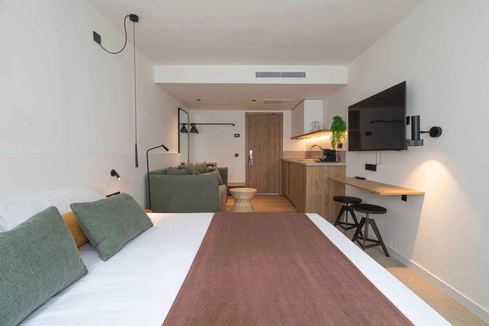 The apart hotel APARTAMENTOS LAS VELAS is located approx. 300 m from a beach. There is a shuttle between the hotel and the airport (for a fee). On the beach are beach towels available. The hotel has a 24h reception, Wi-Fi, an internet corner as well as a TV lounge with satellite TV. In the outdoor area of the property you will find a garden as well as a seasonally open pool, where sun loungers and sun umbrellas are available for free. There is also a children's pool. Furthermore, outside you can find a sun terrace. Inside the hotel you can use a heated indoor pool. You can store your valuables in the safe, and your luggage in the hotel`s storage room. To clean your clothes there is a laundry service (extra fee). If necessary, you can contact the medical centre (for a fee). Guests at the accommodation can get a wake-up call from the hotel personnel. If you want to explore the holiday region, you can use the car and motorbike rental service close to the hotel (extra fee). Catering Breakfast is offered from the buffet. Dinner is also served as a buffet. For the meals, there are a buffet restaurant with terrace (Mediterranean and vegetarian dishes) and the pool bar. Distances