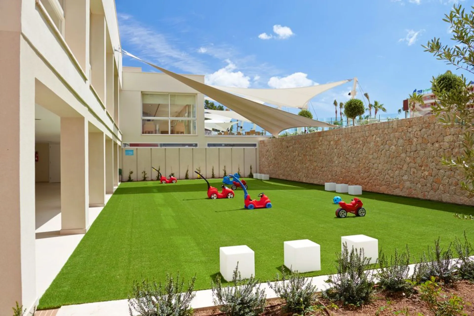 About 150 m from a beach lies the aparthotel Hipotels Coma Gran. Shops are right on your doorstep, a supermarket is also just a few metres away from the hotel. There is a shuttle between the hotel and the airport (for a fee). On the beach are cushions and sun umbrellas available. The hotel is equipped with a lobby bar as well as Wi-Fi. In the outdoor area of the property you will find a garden as well as a pool (open all year), where you can rent pool towels for a fee and sun umbrellas are available for free. For children there is also a children's pool. Inside the hotel you can use an indoor pool. For the young hotel guests there is a playground. For very young guests, kid`s chairs can also be provided. There is also a laundry service available at an additional cost to customers. If necessary, you can contact the medical centre (for a fee). For conventions and other business meetings, the hotel offers a conference area. If you want to explore the holiday region, you can use the car rental service close to the hotel (extra fee). At the reception, tickets are offered for excursions in the area. Dogs are the only pets allowed in the hotel (on request). Euro/Master Card and Visa are accepted as means of payment. Due to its barrier-free facilities , such as barrier-free entrances, the hotel is also suitable for wheelchair users. Catering Breakfast is offered from the buffet. Lunch and dinner are also served from the buffet. In the gastronomic area also vegetarian and gluten-free dishes are served. Distances