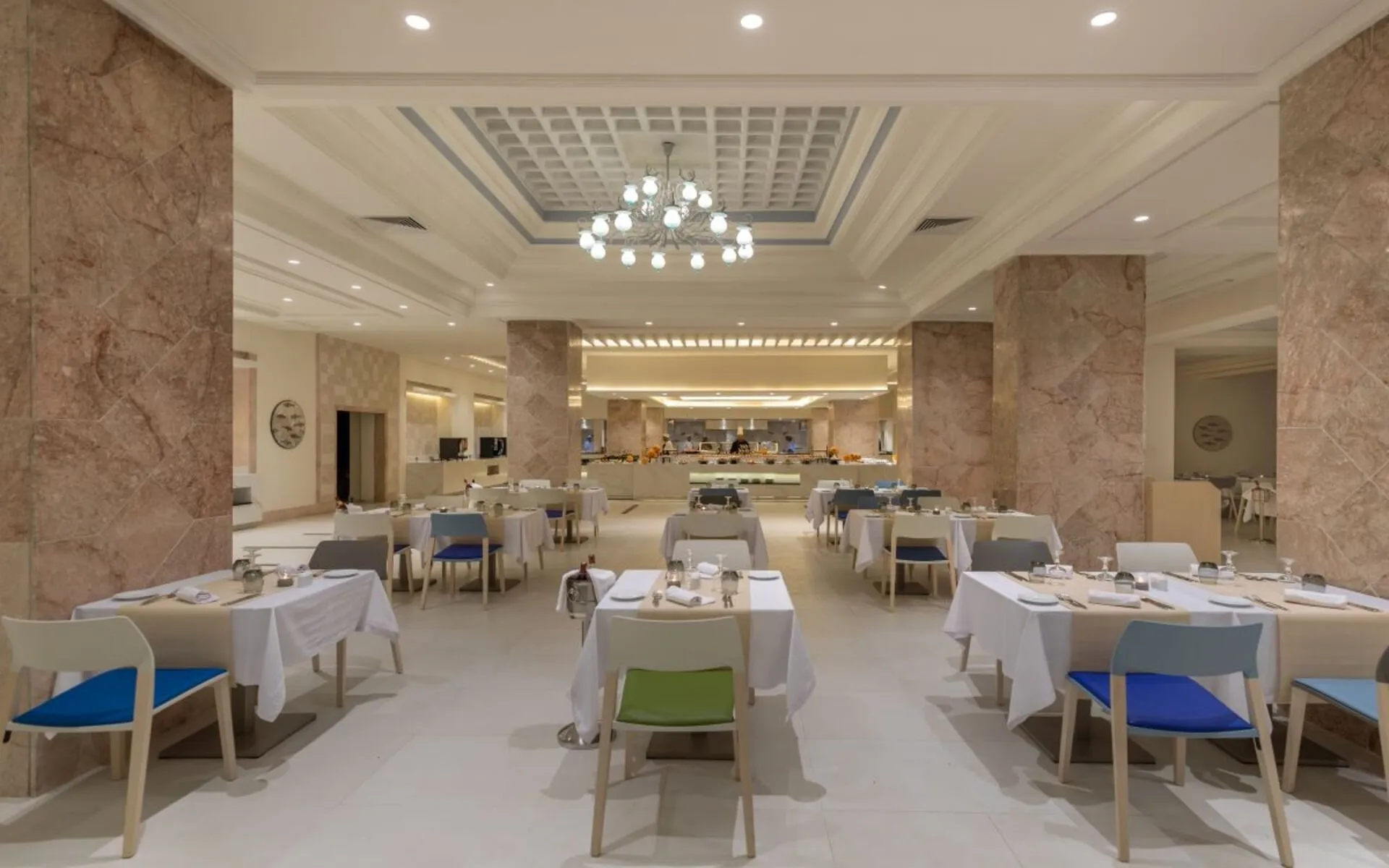 The 5 star aparthotel Royal Azur Hotel Thalassa is located approximately 150 m from the private beach. The city centre is around 13 km away. On the beach are cushions and beach towels available. Cold drinks are served at the beach bar. The hotel is equipped with a 24h reception (check-in is possible around the clock), a lobby bar, Wi-Fi, a lift, a supermarket and other shops, a boutique, parking spaces as well as a TV lounge with satellite TV. Outside there is a children's pool, where sun loungers, sun umbrellas and pool towels are available for free. Furthermore, you can relax outdoors on the terrace and in the garden. Inside the hotel you can use an indoor pool. In addition, the hotel Royal Azur Hotel Thalassa is video-monitored 24h a day. For your entertainment, the hotel offers a disco. There is also a laundry service available at an additional cost to customers. For conventions and other business meetings, the hotel offers a conference area with internet access. Due to its barrier-free facilities , such as barrier-free entrances, the hotel is also suitable for wheelchair users. Catering As catering services the hotel offers all-inclusive. Breakfast is offered from the buffet. Dinner is also served as a buffet. When booking all-inclusive, one meal in the à la carte restaurant is included. The drinks menu of the hotel includes water, soft drinks, coffee and tea, beer and wine. Distances
