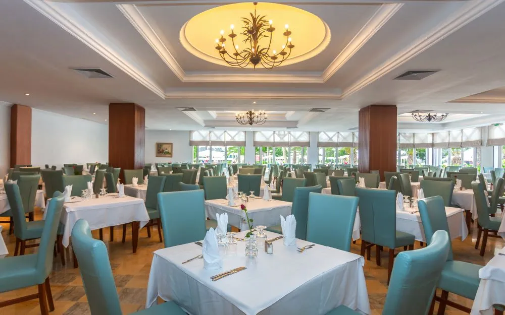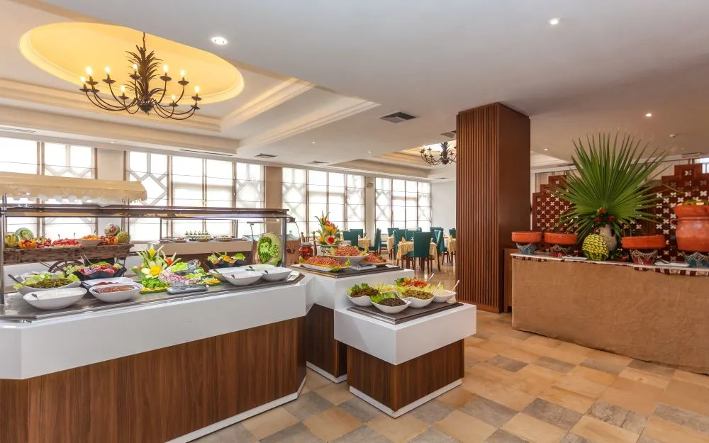 Restaurant principal tip bufet, Restaurant a la carte: ”El Fell”, restaurant pe plajă; Baruri: Coffee Shop, ”Camelia” Bar, ”Dahlia” Piano Bar, ”Equinox” Bar, ”Les Jasmins” Cafe, ”Le Palace” Disco.