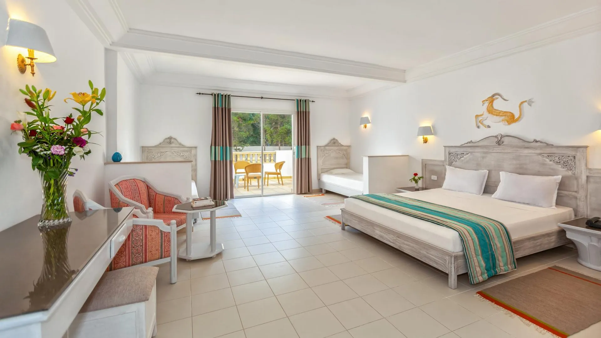 Descriere generală La cca. 300 m de o plajă privată cu nisip veți găsi hotelul Zodiac. Pe plajă sunt disponibile gratuit șezlonguri și umbrele de soare. Centrul turistic al stațiunii se află la aprox. 2 km. Orașul Hammamet este la aprox. 12 km (Tunis cca. 60 km). Puteți face cumpărături în diverse magazine și într-un supermarket aflat la cca. 2 km distanță. De asemenea, cele mai apropiate baruri și restaurante sunt la cca. 2 km. O discotecă aflată la aprox. 5 km vă invită la dans. Există un teatru la aprox. 10 km de hotel. Următoarele atracții pot fi accesate de la hotel: Carthage Land (cca. 1 km). Aveți la dispoziție o stație de autobuz (cca. 300 m) și o stație de taxi (cca. 100 m) cea ce vă oferă mobilitate în timpul vacanței. În locuri mai îndepărtate se poate ajunge cu trenul. Gara cea mai apropiată este prin gara aflată la aproximativ 12 km. Pentru îngrijiri medicale în caz de urgență, există un spital la cca. 10 km distanță. Aeroportul (MIR) se află la aprox. 80 km. Un serviciu de transfer (contra cost) face legătura între hotel și aeroport. Un alt aeroport (NBE) este la cca. 45 km. Facilități Acesta oferă oaspeților săi recepție deschisă 24h (check-in de la 12:00, check out până la 10:00), lobby cu bar, 2 lifturi, aer condiționat, seif (contra cost), parcare (gratuită) și birou de schimb valutar. Pentru a servi masa vă stau la dispoziție un restaurant cu aer condiționat. Este posibil să se perceapă un cost suplimentar pentru room service. Piscină În grădinile acestui hotelul decorat în stil mediteranean există o piscină încălzită precum și o piscină separată pentru copii și un tobogan de apă. Acolo sunt disponibile gratuit șezlonguri și umbrele de soare. Catering Mic dejun bufet suedez. Demipensiunea include micul dejun și cina. Sport/Leisure Este disponibil: Tenis (contra cost, la cca. 1 m distanță), minigolf și volei. La cca. 10 km de hotel este un teren de golf. Oferte de wellness: Masaje posibil contra cost. Teren de joacă. Informații suplimentare Pentru anumite facilități sau activități se pot aplica taxe suplimentare. Unele servicii depind de anotimp și de condițiile climatice locale. Limbi de serviciu: engleză, germană, franceză și arabă. Carduri de credit: Euro/MasterCard și Visa. 1 Schlafzimmer Standard Familienzimmer (Balkon oder Terrasse): Cameră cu pat pentru bebeluși (contra cost), balcon și TV prin satelit precum și aer condiționat controlat central. Doppel Standard Zimmer: Cameră cu pat pentru bebeluși (contra cost), balcon și TV prin satelit precum și aer condiționat controlat central. Einzelbelegung Standard Zimmer: Dotate cu pat pentru bebeluși (contra cost), balcon și TV prin satelit precum și aer condiționat controlat central. Single mit Kind Standard Zimmer: Dotate cu pat pentru bebeluși (contra cost), balcon și TV prin satelit precum și aer condiționat controlat central.