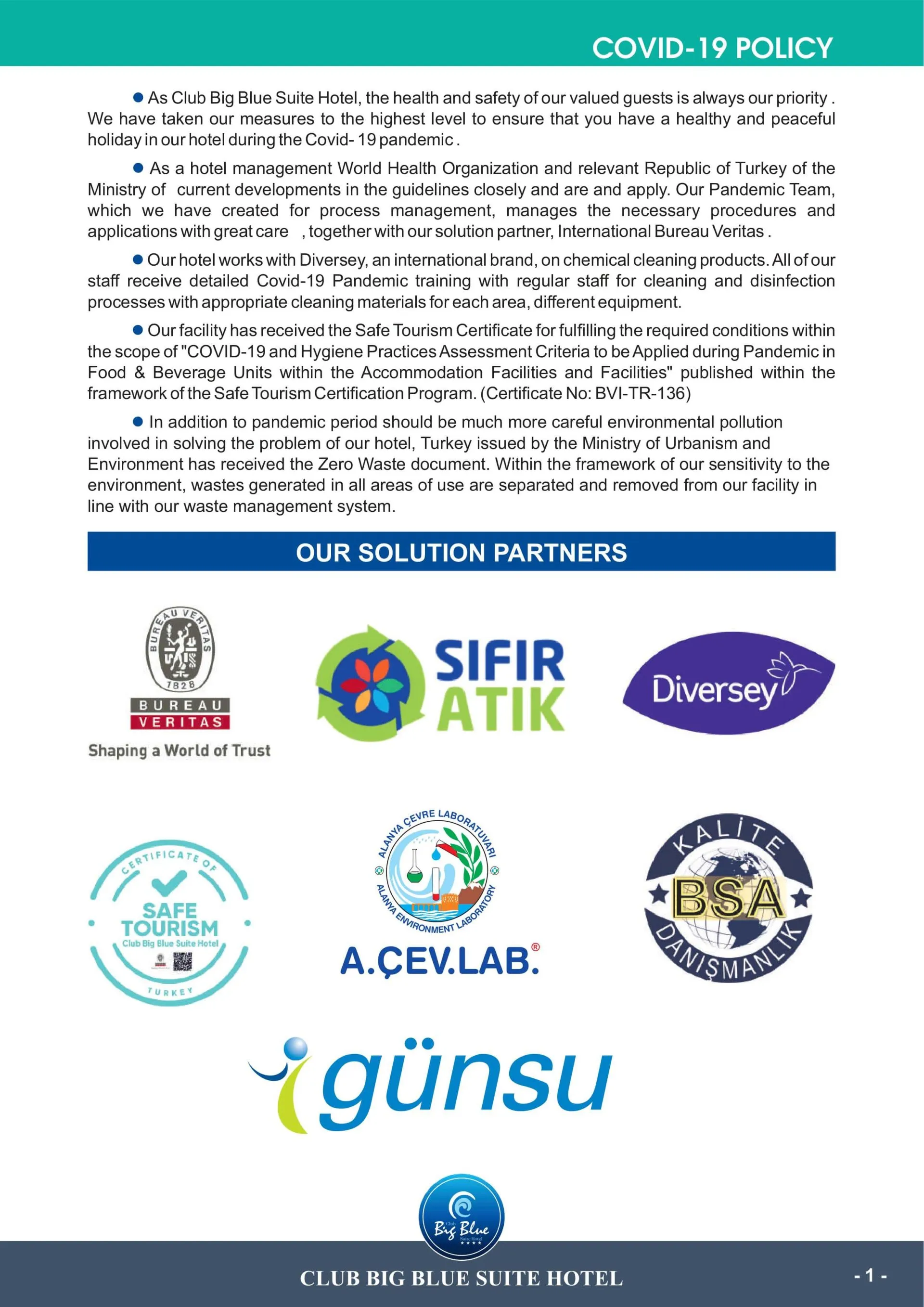 Descriere generala:Acest hotel încântător, perfect ca destinație de familie, este situat în Alanya area. Unitatea de cazare se află la 2. 0 kilometru(i) de principalele conexiuni de transport public. Cea mai apropiată plajă se află la 400 metri de unitatea de cazare. Hotelul este la 2. 0 kilometru(i) de port. Cele 127 camere de oaspeți primitoare oferă un spaţiu perfect pentru relaxarea de la sfârşitul zilei. Această unitate de cazare a fost renovată complet în anul 2017. Sunt disponibile conexiuni la internet prin cablu şi wireless. Recepţia oferă servicii 24 de ore. De asemenea, la cerere, Club Big Blue Suite Hotel oferă paturi suplimentare pentru copii. Niciun animal de companie nu este acceptat în incintă. Toți oaspeții care stau la această proprietate pot folosi garajul propriu al incintei. Club Big Blue Suite Hotel oferă, pentru comoditatea oaspeţilor, un serviciu de transfer. null Oaspeţii se pot destinde complet la facilităţile de întreţinere şi relaxare. Oferta variată de divertisment pusă la dispoziţie în această proprietate garantează faptul că oaspeţii săi se vor bucura de o şedere deosebit de plăcută. Călătorii de afaceri pot folosi sălile de evenimente, ideale pentru a găzdui un seminar de afaceri sau o ocazie specială. Unele dintre aceste servicii ale Club Big Blue Suite Hotel pot fi contra cost. Locatia:2017 Anul construcției; 2024 Anul celei mai recente renovări; 125 Numărul total al camerelor; 7 Numărul etajelor (clădirea principală) Tip hotel:hotel Metode de plata:MasterCard; Visa; Maestro; Visa Electrón Distanta (in metri):Centrul orașului (25000); Stație de autobuz/tren (2000); Cea mai apropiată stație de autobuz/metrou (62000); Aeroport (135000); Port (2000); Plajă (500) Facilitati camera (standard):Wi-Fi; Camere de fumători Facilitati:Accesibil scaunelor cu rotile; Parcare; Recepție deschisă 24 de ore; Ora sosirii (check-in); Ora plecării (check-out); Extindere oră plecare (late check-out) (Extra Fee); Acoperire telefon mobil; Internet prin cablu (Extra Fee); Wi-Fi (Extra Fee); Apeluri locale și internaționale (Extra Fee); Închiriere mașini (Extra Fee); Serviciu de transfer (Extra Fee); Transfer la aeroport (Extra Fee); Serviciu de spălătorie (Extra Fee); Spălătorie (Extra Fee); Servicii medicale (Extra Fee); Serviciu de închiriere biciclete (Extra Fee); Personal multilingv; Pază 24 de ore; Serviciu de bagaje; Aer condiționat în locurile publice; Detector de fum; Seif în hotel (Extra Fee); Facilități de schimb valutar; Lift; Magazin (Extra Fee); Terasă; Terasă la soare; Sală de sport; Sală de bagaje; 1 Prăjitor de pâine; Zonă de luat masa; Grătar/BBQ; Zonă privată de plajă; Bibliotecă; Fierbător electric; Prosoape și lenjerie de pat Catering:Bar; Restaurant; Zonă de nefumători; Scaune pentru copii; Snack bar lângă piscină; Aer condiționat în restaurant; Cameră pentru micul dejun Afaceri:Imprimantă (Extra Fee); Fotocopiator (Extra Fee); Fax (Extra Fee) Divertisment:1 Zonă de înot pentru copii; Șezlonguri; Parasolare; Piscină cu tobogane; Zonă de joacă pentru copii; Club de copii; Program de divertisment pentru adulți; Program de divertisment pentru copii; Sală cu TV; Sală de jocuri Sanatate:Saună (Extra Fee); Baie de aburi; Baie turcească (hamam); Masaj (Extra Fee); Tratamente spa (Extra Fee); Salon de coafură (Extra Fee); Centru spa (Extra Fee) Info:Bureau Veritas Info:Türkiye Sustainable Tourism lndustry Criteria (TR-I) Tipuri de mancare:Mic dejun bufet; Mic dejun continental; Mic dejun târziu (Late riser breakfast); Prânz bufet; Cină bufet; All inclusive; All inclusive cu băuturi non-alcoolice; All inclusive cu băuturi alcoolice, mărci proprii; All inclusive cu băuturi alcoolice, mărci de top; Mâncăruri fără gluten; Mâncăruri vegetariene; Gustări; Vegan meal; Halal meal Lucruri de retinut:Depozit la sosire; Card de identitate la sosire; Clădire de nefumători Sporturi:Tenis de masă; Fitness; Ciclism/Ciclism alpin (Extra Fee); Volei; Volei de plajă; Biliard (Extra Fee); Darts Healthy & Safety (COVID):Turkey - Safe Tourism Certificate