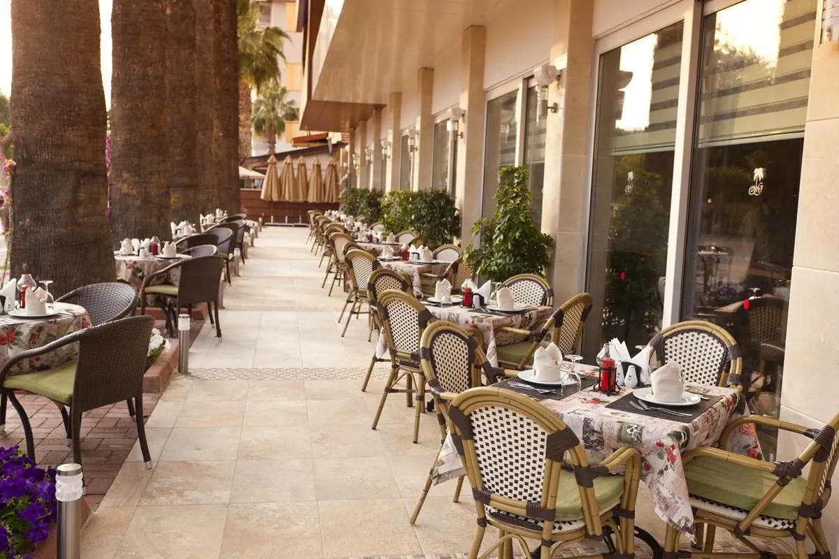 Descriere generală Hotelul Gardenia Hotel Alanya este situat direct pe o plajă cu nisip. Pe plajă sunt disponibile umbrele de soare și șezlonguri la un cost suplimentar. Orașul Side este la aprox. 60 km (Antalya cca. 130 km). Locul de cazare are la dispoziție mașini de închiriat. De asemenea, aveți în apropiere o stație de taxi (cca. 20 m) cea ce vă garantează mobilitatea în vacanță. Aeroportul (AYT) se află la aprox. 122 km. Un alt aeroport (GZP) este la cca. 42 km. Facilități Încântătorul hotel dispune de 5 etaje și peste 119 camere. Acesta oferă oaspeților săi recepție deschisă 24h (check-in de la 14:00, check out până la 12:00), lobby cu bar, un total de 4 lifturi, aer condiționat, minimarket și alte magazine. Accesul la internet WiFi poate fi utilizat de oaspeții hotelului contra cost. În plus, hotelul oferă o zonă de conferințe. Pentru oaspeții cu dizabilități fizice, unitatea de cazare oferă băi parțial accesibile pentru scaune cu rotile. Serviciul de menaj este gratuit. Room service, spălătorie, călcat și serviciul medical sunt disponibile la un cost suplimentar. Piscină Zona exterioară a hotelului include o piscină precum și o piscină pentru copii. Acolo sunt disponibile gratuit șezlonguri și umbrele de soare. La barul piscinei va puteți bucura de o băutura răcoritoare. Catering Mic dejun (între orele 07:00 - 10:00) bufet suedez. All Inclusive: micul dejun, prânzul și cina. Micul dejun, prânzul și cina pot fi servite numai în anumite restaurante. Apă. Mic dejun târziu (între orele 10:00 - 10:30), băuturi răcoritoare (10:00 - 23:00), cafea și ceai (10:00 - 23:00), prăjituri și produse de patiserie (15:00 - 16:30), bere (10:00 - 23:00), vin (10:00 - 23:00) și băuturi alcoolice naționale (10:00 - 23:00). Sport/Leisure Este disponibil: Volei pe plajă, tenis de masă (contra cost), biliard (posibil contra cost), fitness, darts (gratuit) și tenis (contra cost). Pe plajă puteți practica sporturi nautice precum jet ski și schi nautic (unele de către furnizori locali). Există serviciu de închiriere de biciclete. Oferte de wellness: Zonă de spa, saună, hamam și masaje contra cost. Divertisment pentru adulți: spectacole de seară și muzică live. Informații suplimentare Pentru anumite facilități sau activități se pot aplica taxe suplimentare. Unele servicii depind de anotimp și de condițiile climatice locale. Limbi de serviciu: engleză, germană și turcă. Carduri de credit: Visa și Euro/MasterCard. Doppel Comfort Zimmer: Dotate cu pat francez sau pat single, pat pentru bebeluși (gratuit), încălzire reglabilă individual, minibar (posibil contra cost), balcon, seif (contra cost) și TV prin satelit precum și aer condiționat reglabil individual. Baie cu duș. Doppel Standard Zimmer: Cameră cu pat francez sau pat single, pat pentru bebeluși (gratuit), încălzire reglabilă individual, minibar (posibil contra cost), balcon, seif (contra cost) și TV prin satelit precum și aer condiționat reglabil individual. Baie cu duș. Doppel Standard Zimmer (Economy): Cameră cu pat pentru bebeluși (gratuit), încălzire reglabilă individual, minibar (posibil contra cost), seif (contra cost) și TV prin satelit precum și aer condiționat reglabil individual. Baie cu duș. Einzelbelegung Standard Zimmer: Dotate cu pat pentru bebeluși (gratuit), încălzire reglabilă individual, minibar (posibil contra cost), seif (contra cost) și TV prin satelit precum și aer condiționat reglabil individual. Baie cu duș.