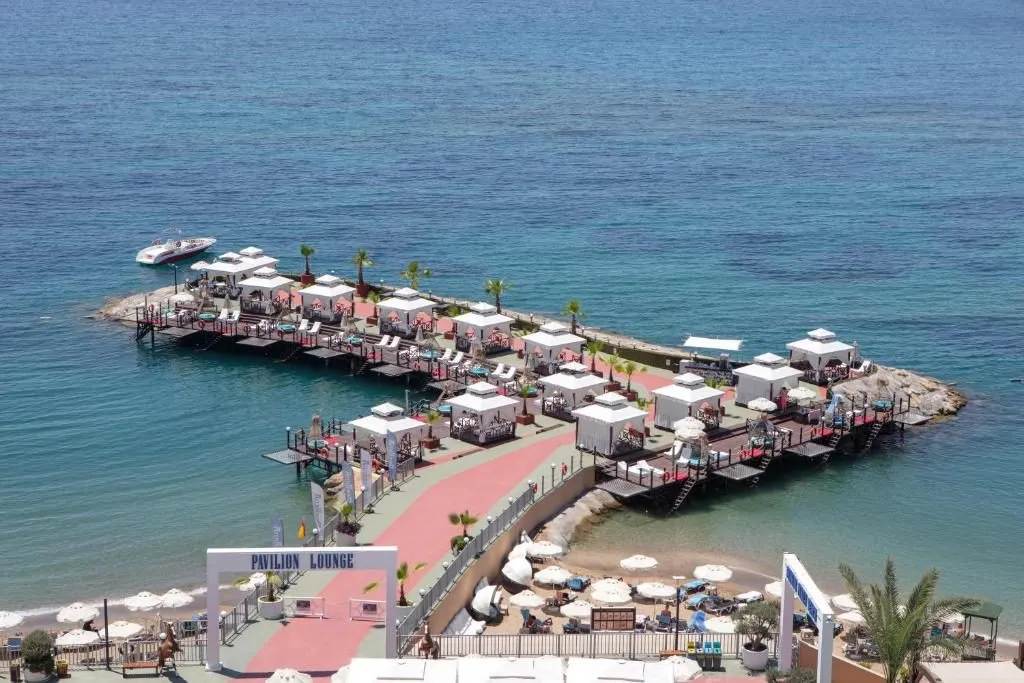 Plajă proprie cu nisip și pietriș, lungime: 50 metri, ponton – 4.500 mp; Aqua Park cu trei tobogane – 483 mp; Piscina principală – 1.168 mp, piscină pentru copii – 125 mp, piscină interioară pentru copii – 25 mp, piscină interioară – 125 mp, piscină Thalasso – 37 mp, piscină VIP – 95 mp. Șezlonguri, saltele, umbrele și prosoape gratuite atât la plajă, cât și la piscină.