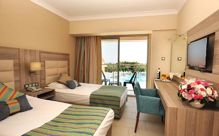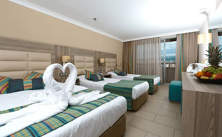 Descriere generala: Aqua park Centru Wellness & Spa Diversitate culinară Recomandat pentru un sejur activ         Principalele puncte de atracție: Aqua park Centru Wellness & SpaDiversitate culinarăRecomandat pentru un sejur activ         Descriere hotel: Hotelul este situat direct pe plajă, la 200 m de stațiunea Konakli, la 13 km de oraşul Alanya şi la 110 km de aeroportul din Antalya. Facilități si dotari camere: Hotelul este format din clădirea principală și are 294 camere, împărţite astfel: 197 camere standard (~ 20 mp), 95 camere familiale (~ 25 mp), 2 camere pentru persoanele cu dizabilități.Dotări camere: baie proprie cu cadă/duş, aer condiționat, TV, seif, mini-bar, uscător de păr, telefon, balcon. Servicii zilnice de menaj. Sport și relaxare: Baie turcească, saună, sală de fitness, tenis de masă, darts, programe de animație, biliard, sporturi nautice, basket, volei, teren de tenis. Facilități pentru copii: Mini Club (pentru copiii cu vârsta cuprinsă între 4-12 ani, în intervalul orar 10:00-12:00/ 14:30-17:00), piscină pentru copii. Facilități gratuite: Baie turcească, saună, sală de fitness, tenis de masă, darts, programe de animație, acces internet Wi-Fi (în lobby), basket, volei, teren de tenis. Facilități contra cost: Centru Spa, masaj, centru de înfrumusețare, coafor, biliard, echipament pentru tenis, nocturnă teren de tenis, închiriere mașini, sporturi nautice, servicii de curățătorie. Regim de masă: Ultra All Inclusive:- Mic dejun, prânz şi cină tip bufet- Băuturi alcoolice și non-alcoolice locale- Mini-bar alimentat zilnic cu băuturi răcoritoare, apă.- Baie turcească, saună, sală de fitness, tenis de masă, darts, programe de animație, acces internet Wi-Fi (în lobby), basket, volei, teren de tenis Bine de stiut: După ora 03:00 toate serviciile și activitățile sunt contra cost.Restaurantul á la carte - o cină gratuită/ sejur, cu rezervare în prealabil. Nu este permis accesul persoanelor sub 12 ani. Locatia: Hotelul se află pe plajă, la o distanţă de 13 km de Alanya şi la 110 km de aeroportul din Antalya. Soare si mare: Plajă privată; aquapark cu 3 tobogane; piscină interioară, piscină exterioară, piscină pentru copii; umbrele, şezlonguri, saltele şi prosoape gratuite, atât la plajă cât şi la piscină. Restaurante si baruri: Restaurant principal; Restaurant a la carte; Beach Bar, Garden Snack Bar, Pool Bar, Lobby Bar, Disco.