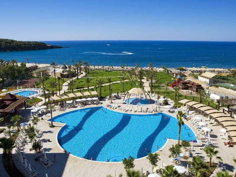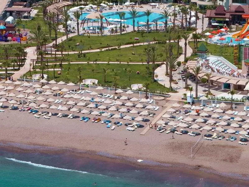 This family-friendly beach resort, built in 2007, is located 500 meters from Okurcalar's center, offering easy access to restaurants, bars, nightlife, shops, and public transport. Situated directly on the beachfront, it's approximately 33 km from Alanya's center, Alanya Castle, and the Damlata Caves, 27 km from Side's city center, and 90 km from Antalya Airport. The hotel features 333 rooms, five bars, and an all-inclusive program catering to all ages. Guests can enjoy multiple pools and a luxurious spa with a wide array of treatments. Three restaurants provide varied dining options, including two seasonal à la carte menus. The air-conditioned spa complex guarantees a memorable stay.