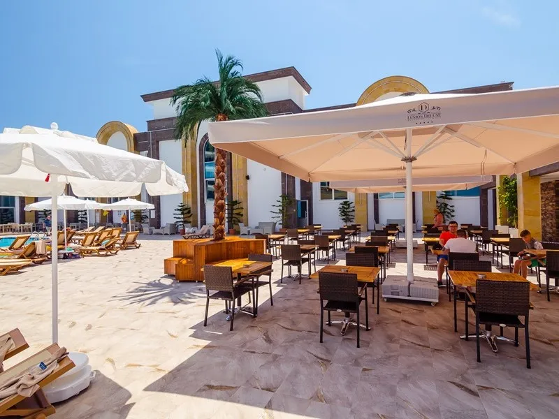 mic dejun, pranz si cina in regim bufet cu servire in restaurantul principal, gustari, pranz, salate si fructe la Aqua Snack si Beach Snack intre orele 11:00-17:00, gustare tarzie si diverse deserturi in Patisserie intre 10.00-18:00 si intre 23:30-01:00, inghetata in timpul cinei, intrare la restaurantele a la carte o data pe sejur cu rezervare in prealabil, bauturile alcoolice si nealcoolice locale si unele de import cu servire 24h la Lobby Bar, intre 10:00 si 24:00 la Pool Bar si la barul Aqua ( de langa Aquapark) si intre 10:00-18:00 la barul de pe plaja, 2 picine exterioare si o piscina interioara, gimnastica matinala, aerobic, voleiball pe plaja, gimnastica in apa, darts, echipa de animatie si spectacole seara, mini club 04-12 ani, fitness center, baie turceasca, aquapark si Funfair, club de noapte, mini disco si teren de joaca pentru copii, conexiune WiFi in hotel si in proximitatea imediata, sezlonguri si umbrele la palja si piscina, prosoape la plaja si piscina