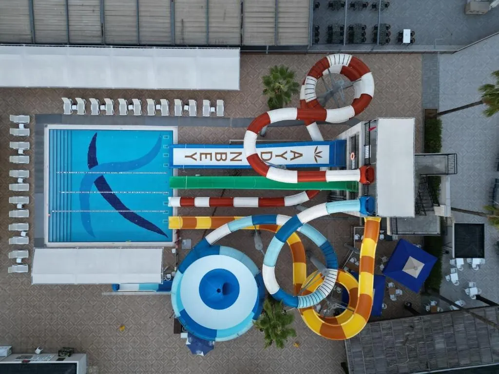 Plajă proprie la o distanță de aproximativ 2 km, (shuttle bus); piscină exterioară (cca. 964 mp), piscină pentru copii (cca. 77 mp), piscină interioară (cca. 130 mp), Aquapark cu 5 tobogane acvatice; Umbrele, șezlonguri și prosoape gratuite, atât pentru plajă, cât și pentru piscină.
