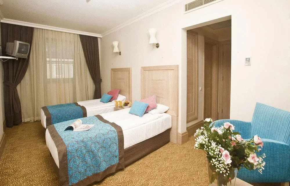Ideal for families with children, this modern furnished hotel consists of 4 buildings and is located on the beach of Belek-Boğazkent, 9 km from the town of Belek, famous for its golf courses. Covering 23,000 m2, the complex features a spacious garden area and a 150m long private beach. Public transport and taxis are available from the hotel entrance providing easy access to nearby places of interest such as the old town and harbour at Antalya and the ancient cities of Perge and Aspendos. It is 50 km from the city centre and 40 km away from the Antalya International Airport. This hotel features spacious and cosy rooms with a mini bar, satellite TV, a work desk and bathroom amenities. The hotel also offers a compact facility which consists of different size of pools and Aqua Park. Location:380 Total number of rooms; 5 Number of floors (main building); 284 Double rooms; 89 Junior suites; 4 Suites; 3 Disability-friendly rooms Hotel type:hotel Methods of payment:MasterCard; Visa Distances (in meters):City centre (9000); Nearest Bus / Metro Stop (50000); Beach (20); Golf course (5000) Room facilities (Standard room):Wi-fi; Wheelchair-accessible; Extra beds on demand Facilities:Wheelchair-accessible; Car park; 24-hour reception; Check-in hour; Check-out hour; Late Check-out (Extra Fee); Wi-fi; Car hire (Extra Fee); Transfer service (Extra Fee); Room service (Extra Fee); Laundry service (Extra Fee); Medical service (Extra Fee); Babysitting service (Extra Fee); Multilingual staff; Bellboy service; Air conditioning in public areas; Smoke detector; Currency exchange facilities; Cloakroom; Lift access; Newspaper stand; Supermarket (Extra Fee); Shop (Extra Fee); Garden; Terrace; Sun terrace; Gym; Luggage room; Private beach area; Towels and bed linen Catering:Café; Bar; 6 Restaurant; Non-smoking area; Smoking area; Highchairs; Poolside snack bar; Show cooking; Air conditioning in Restaurant; 24h dining café Business:Conference room; Meeting room; Projector (Extra Fee); Printer (Extra Fee); Photocopier (Extra Fee) Entertainment:1 Indoor freshwater pool; 3 Outdoor freshwater pool; 1 Children’s swimming area; Sun loungers; Parasols; WaterSlides; Children playground; Kids’ club; Entertainment programme for adults; Entertainment programme for children; Game room Health:Sauna; Steam bath; Turkish bath (hamam); Massage (Extra Fee); Spa treatments (Extra Fee); Hairdressing salon (Extra Fee); Spa centre (Extra Fee)