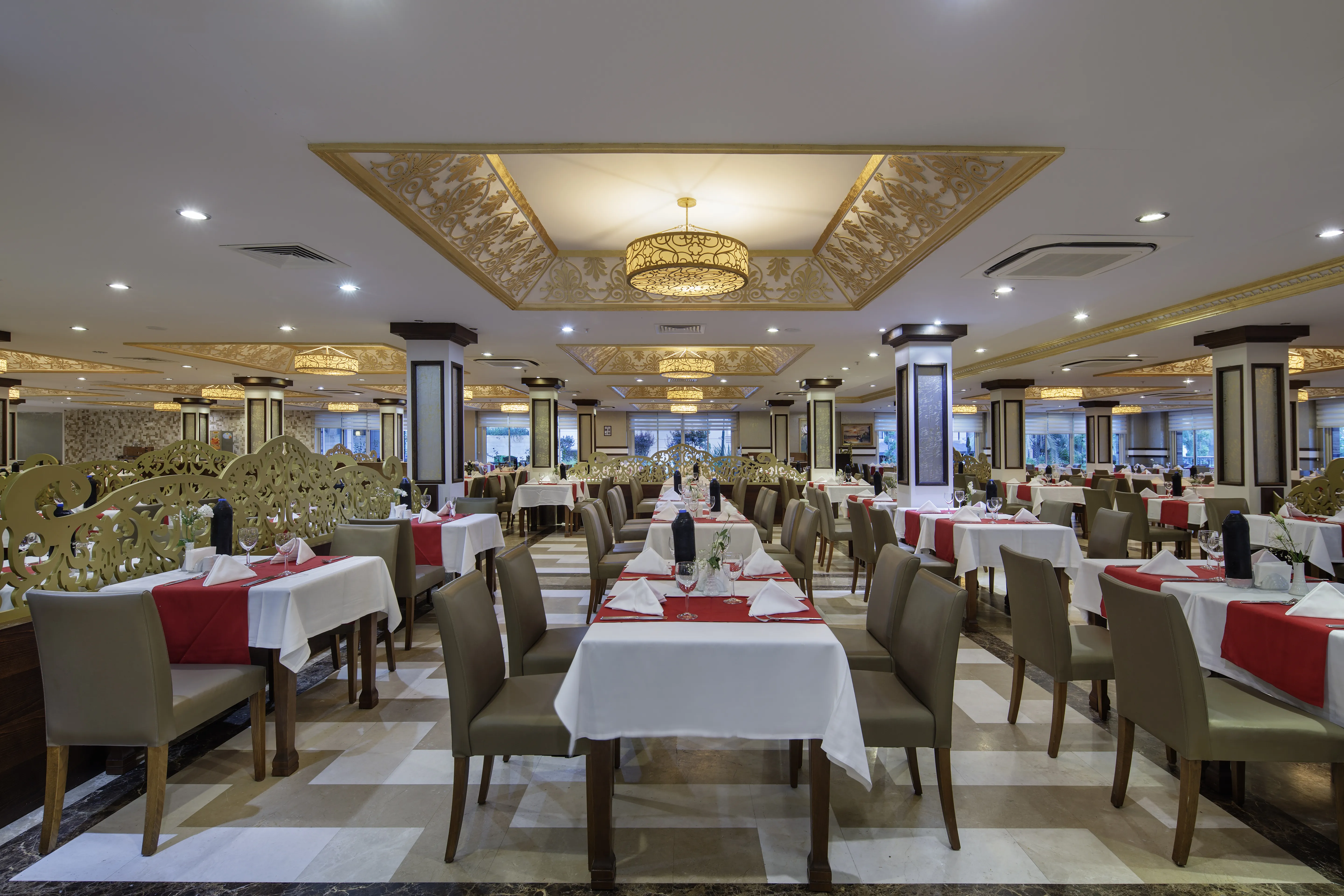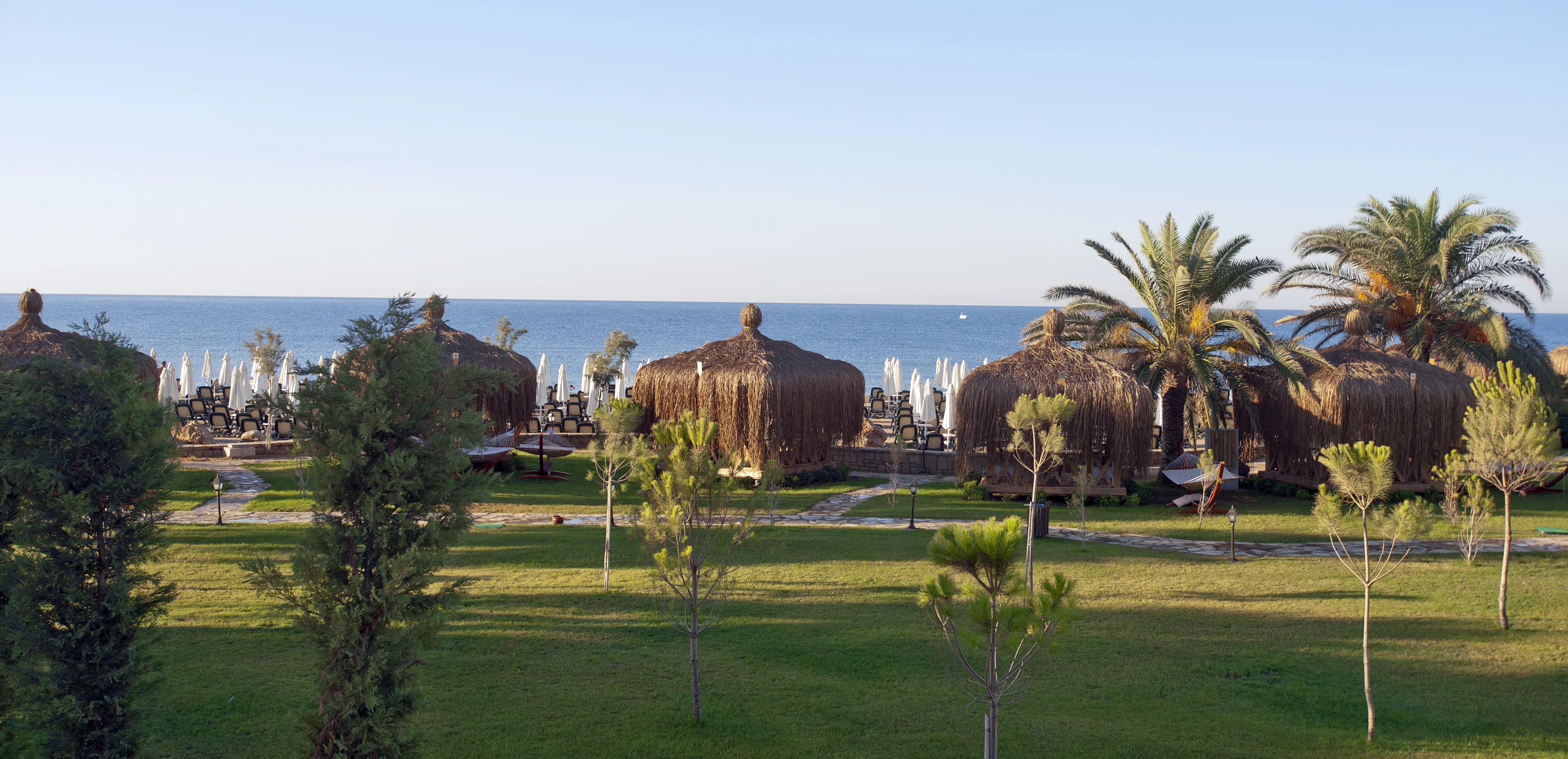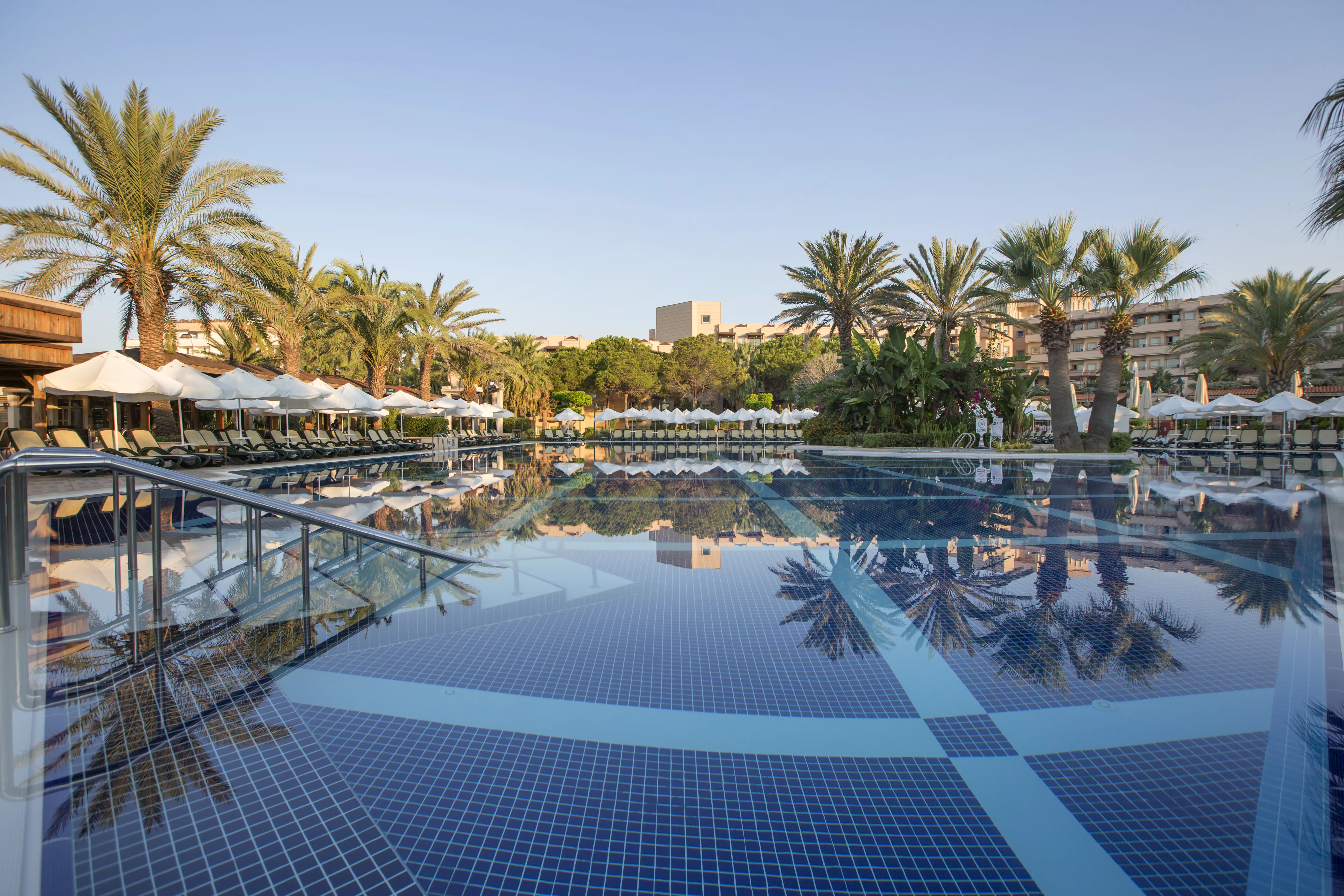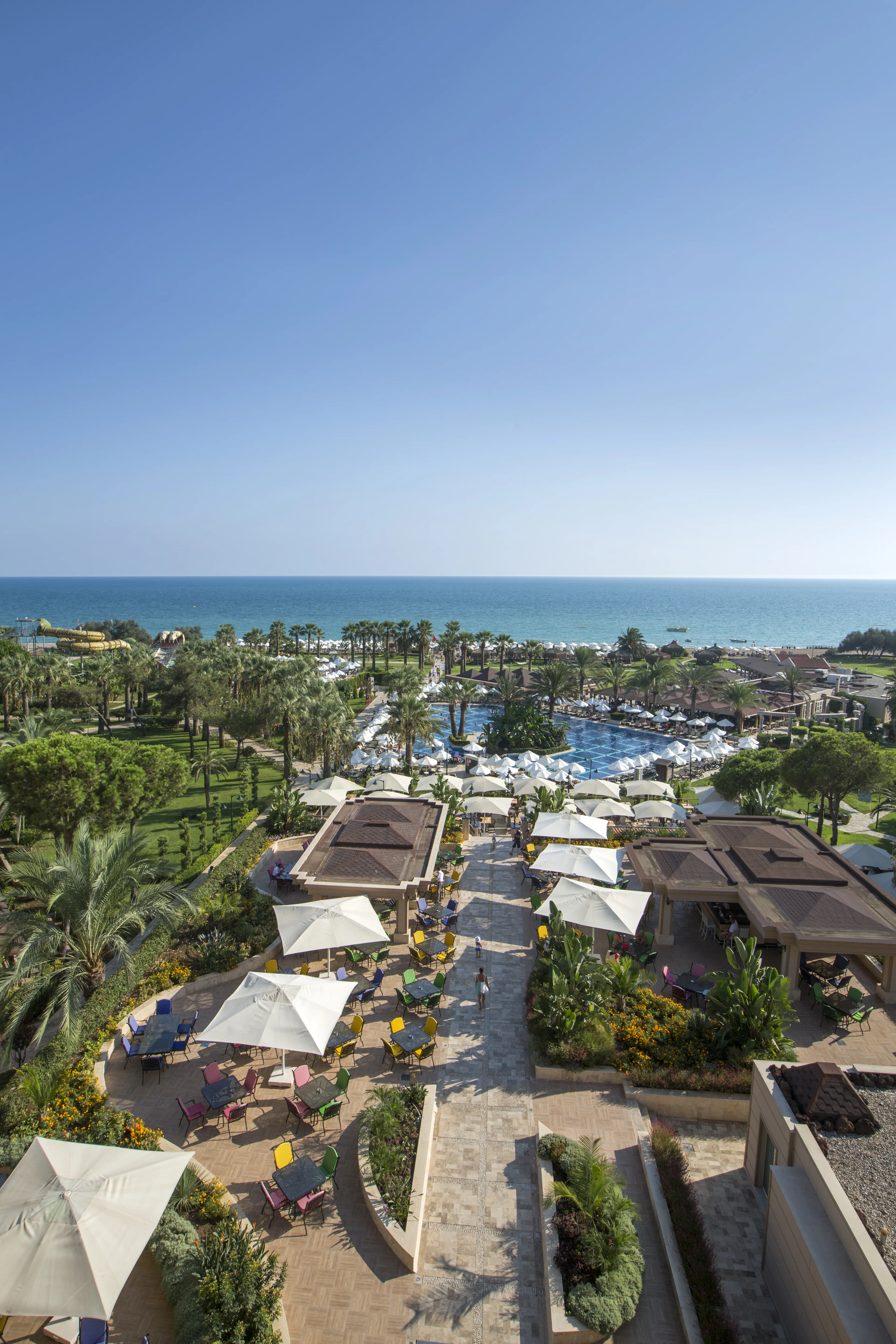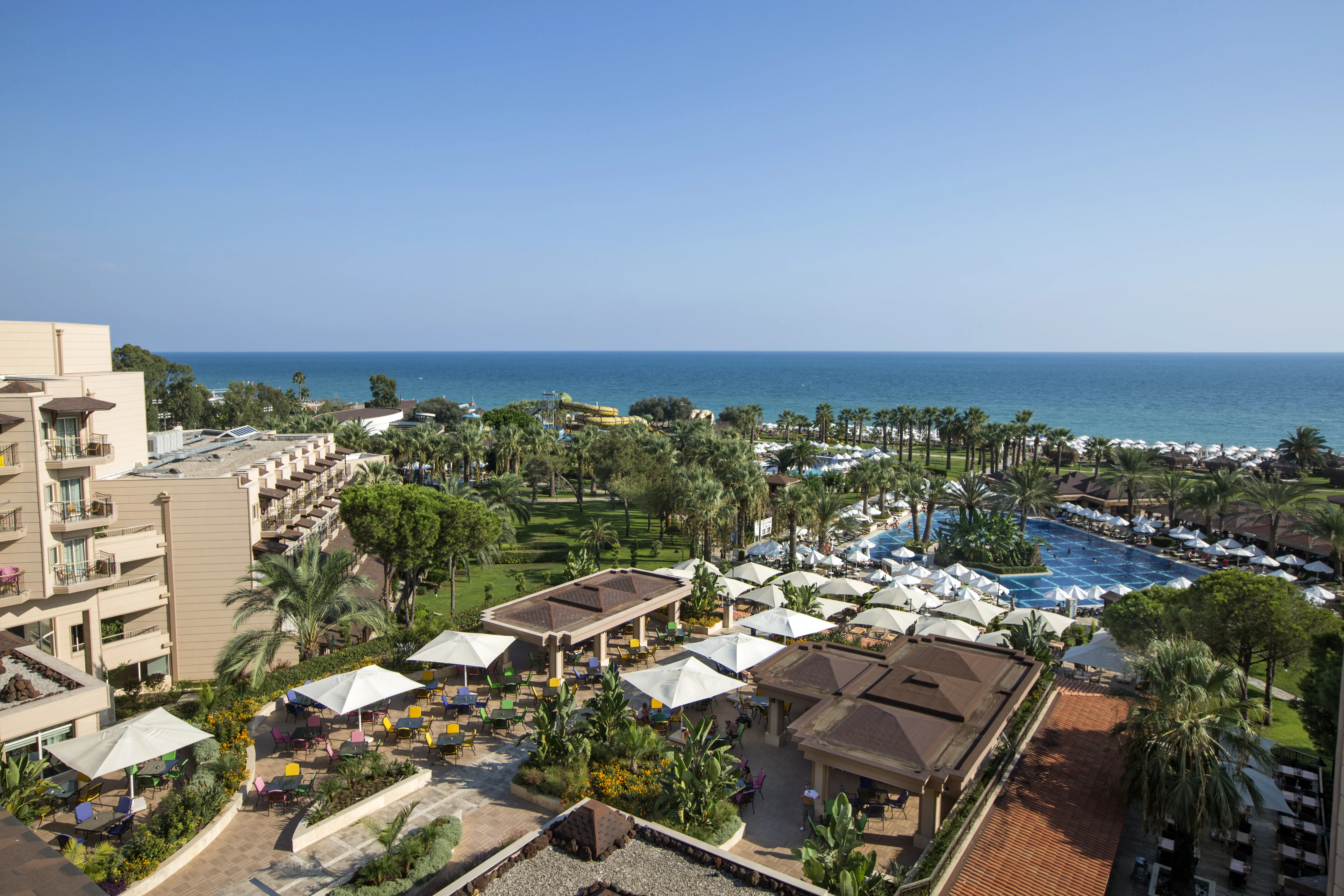 This beach hotel is located directly on the Uckum-Belek coast near Antalya and covers an area of 101,000 m2. It is 35 km away from Antalya Airport and 45 km away from Antalya city centre. Public transport and a taxi rank are available at the hotel entrance. Consisting of 3 hotel buildings and a bungalow building, the complex is ideal for families, offering a 300 m long sandy beach, a variety of pools, and an aqua park. For adults there is a fully equipped spa were they can relax and golf players are sure to enjoy that this hotel features a 27 holes golf course is close-by. The classic guest rooms offer a satellite TV, a safe, minibar, air-conditioning, tea & coffee making facilities and a private balcony. Every room has a private bathroom with shower and a hairdryer. Location:1993 Year of construction; 2012 Year of most recent renovation; 521 Total number of rooms; 4 Number of floors (main building); 5 Number of floors (annexe); 466 Double rooms; 2 Junior suites; 47 Family rooms; 6 Disability-friendly rooms Hotel type:hotel Methods of payment:MasterCard; Visa Distances (in meters):City centre (8000); Nearest Bus / Metro Stop (40000); Airport (17400); Beach (0); Golf course (800) Room facilities (Standard room):Living room; 1 Bathroom; Hairdryer; Wi-fi; TV; Minibar; Centrally regulated air conditioning; Safe; Smoking rooms; Extra beds on demand Facilities:Wheelchair-accessible; Car park; 24-hour reception; Check-in hour; Check-out hour; Late Check-out (Extra Fee); Wi-fi; Local and international calls (Extra Fee); Car hire (Extra Fee); Transfer service (Extra Fee); Room service (Extra Fee); Laundry service (Extra Fee); Medical service (Extra Fee); Babysitting service (Extra Fee); Multilingual staff; 24-hour security; Bellboy service; Air conditioning in public areas; Smoke detector; Currency exchange facilities; Lift access; Supermarket (Extra Fee); Shop (Extra Fee); Garden; Terrace; Sun terrace; Gym; Luggage room; Dining area; Private beach area; Library; Electric kettle; Towels and bed linen Catering:Café; Bar; 5 Restaurant; Non-smoking area; Highchairs; Poolside snack bar; Banquet hall; Air conditioning in Restaurant; 24h dining café Business:Conference room; 1 Meeting room; Projector (Extra Fee); Printer (Extra Fee); Photocopier (Extra Fee); Audio-visual equipment rental (Extra Fee); Fax (Extra Fee) Entertainment:1 Indoor freshwater pool; 1 Outdoor freshwater pool; 1 Children’s swimming area; Sun loungers; Parasols; WaterSlides; Children playground; Kids’ club; Entertainment programme for adults; Entertainment programme for children; TV lounge; Game room Health:Sauna; Steam bath; Turkish bath (hamam); Massage (Extra Fee); Spa treatments (Extra Fee); Hairdressing salon (Extra Fee); Spa centre (Extra Fee) Green Programmes - Worldwide:Green Key (FEE)
