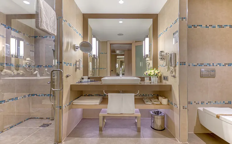 Dotări camere: baie cu cadă/ duş, uscător de păr, papuci şi halat pentru baie, TV satelit, telefon, acces internet Wi-Fi, aer condiţionat, mini-bar (alimentat zilnic cu băuturi răcoritoare), facilităţi ceai/ cafea, balcon/ terasă.