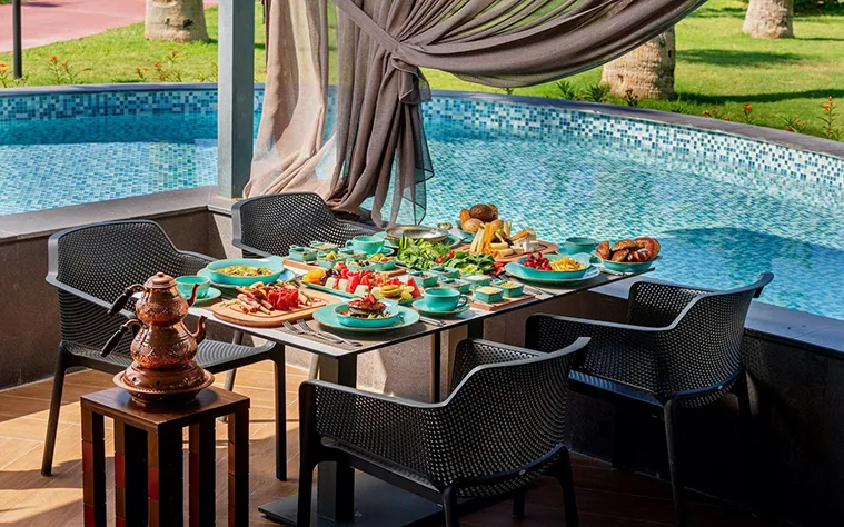 Restaurant principal, tip bufet -“Mega”, restaurant pentru copii - ”Mega Children”, ”Saray Snack”, ”Pizza and Burger House”, 6 restaurante a la carte: ”La Prima” – italian, ”El Porto” – mexican, ”Red far East” – chinezesc, ”Barbeque Court”, ”Sofra” – turcesc, ”Lagos” – pescăresc; ”Mega Bar” – 24h, ”Tennis Bar”, ”Lobby Bar”, ”Pool Bar”, ”Cafe House”, ”Turkuaz Bar”, ”Beach Bar”, ”Disco Bar”.