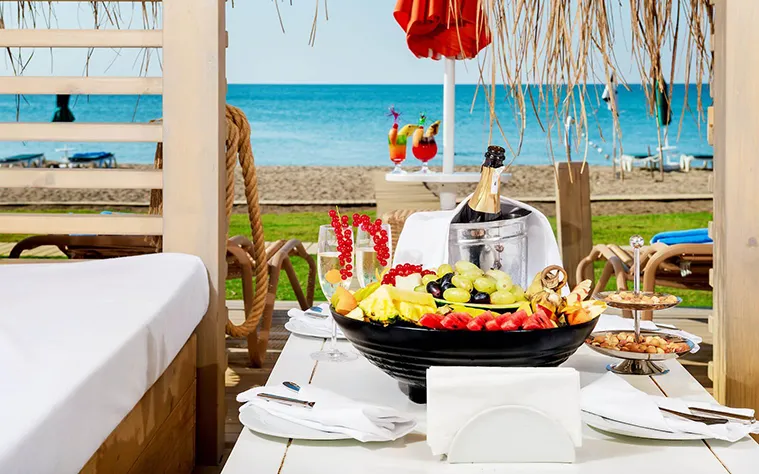 Plajă proprie, cu nisip fin; ponton; 5 piscine exterioare: piscina principală, aqua park, piscină Adults Only, piscină pentru copii, piscina de la clădirile Deluxe, piscină interioară; Umbrele, șezlonguri, saltele şi prosoape gratuite, atât la plajă, cât şi la piscină.