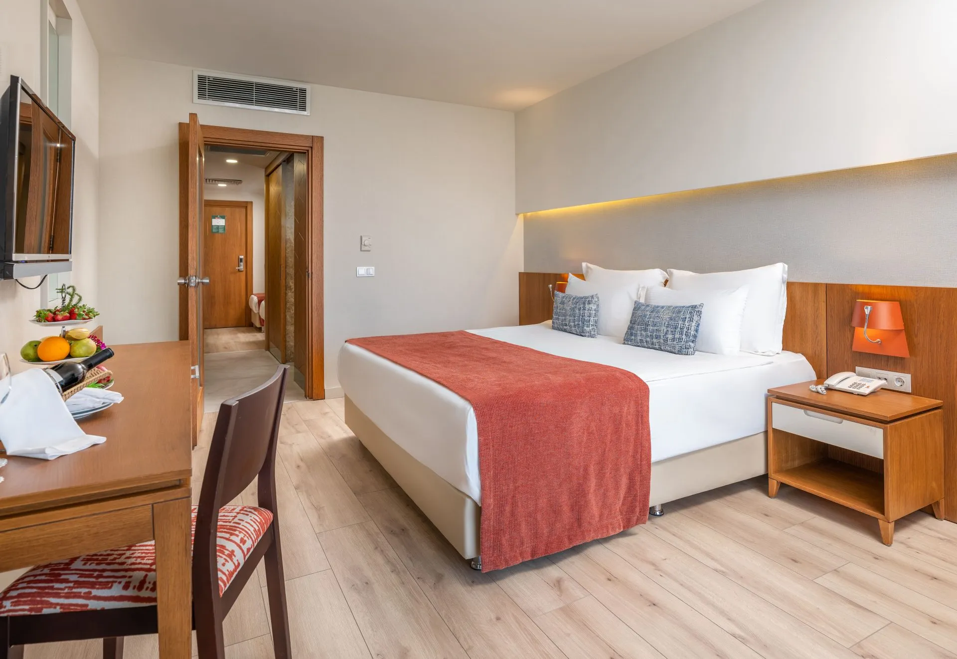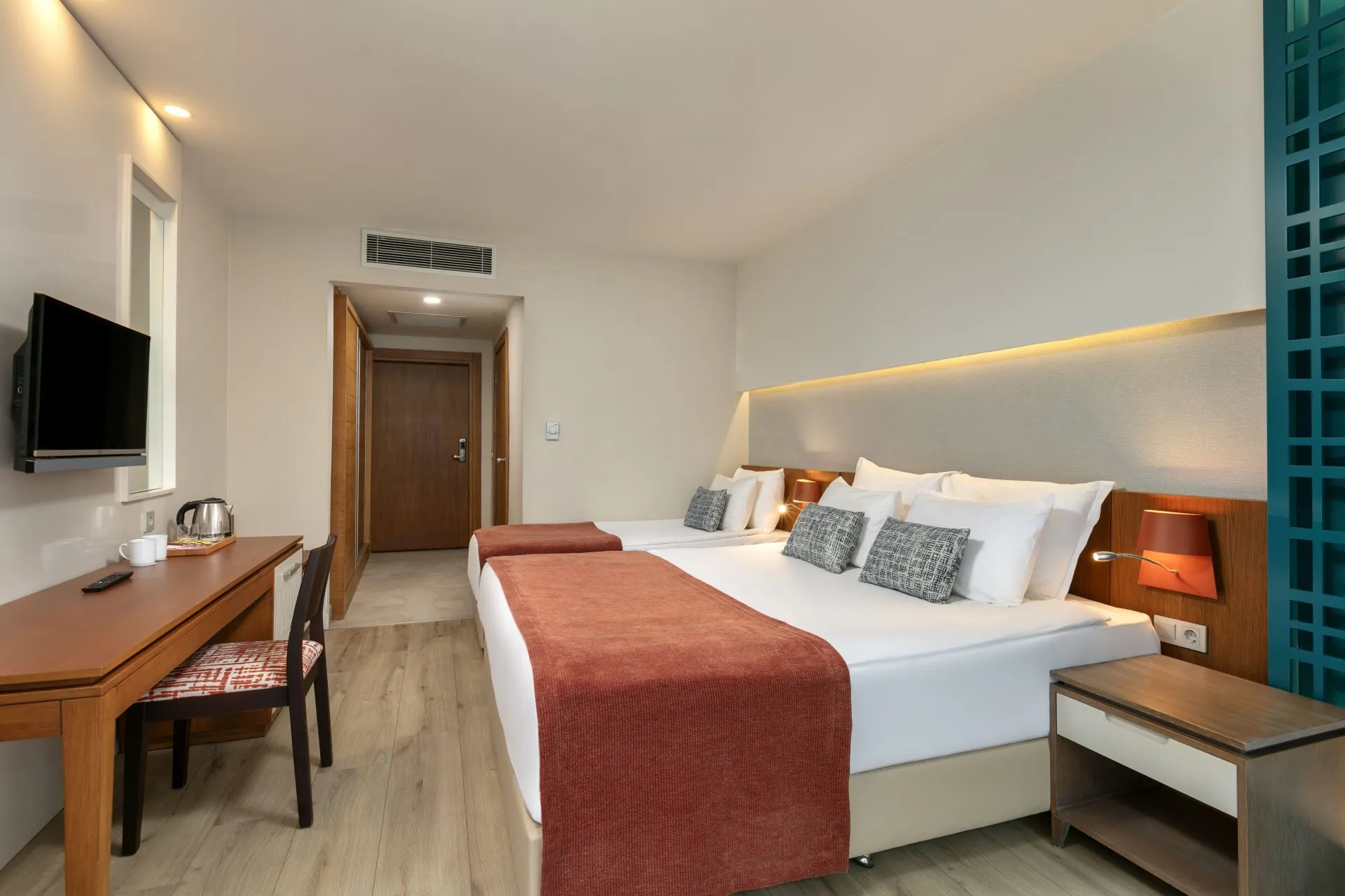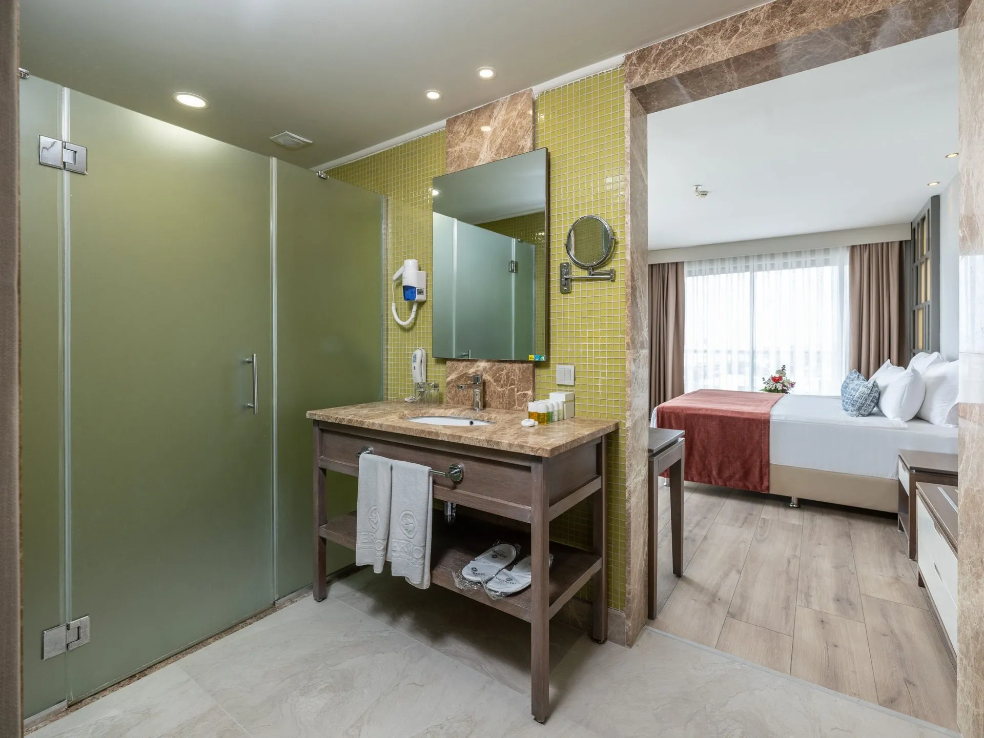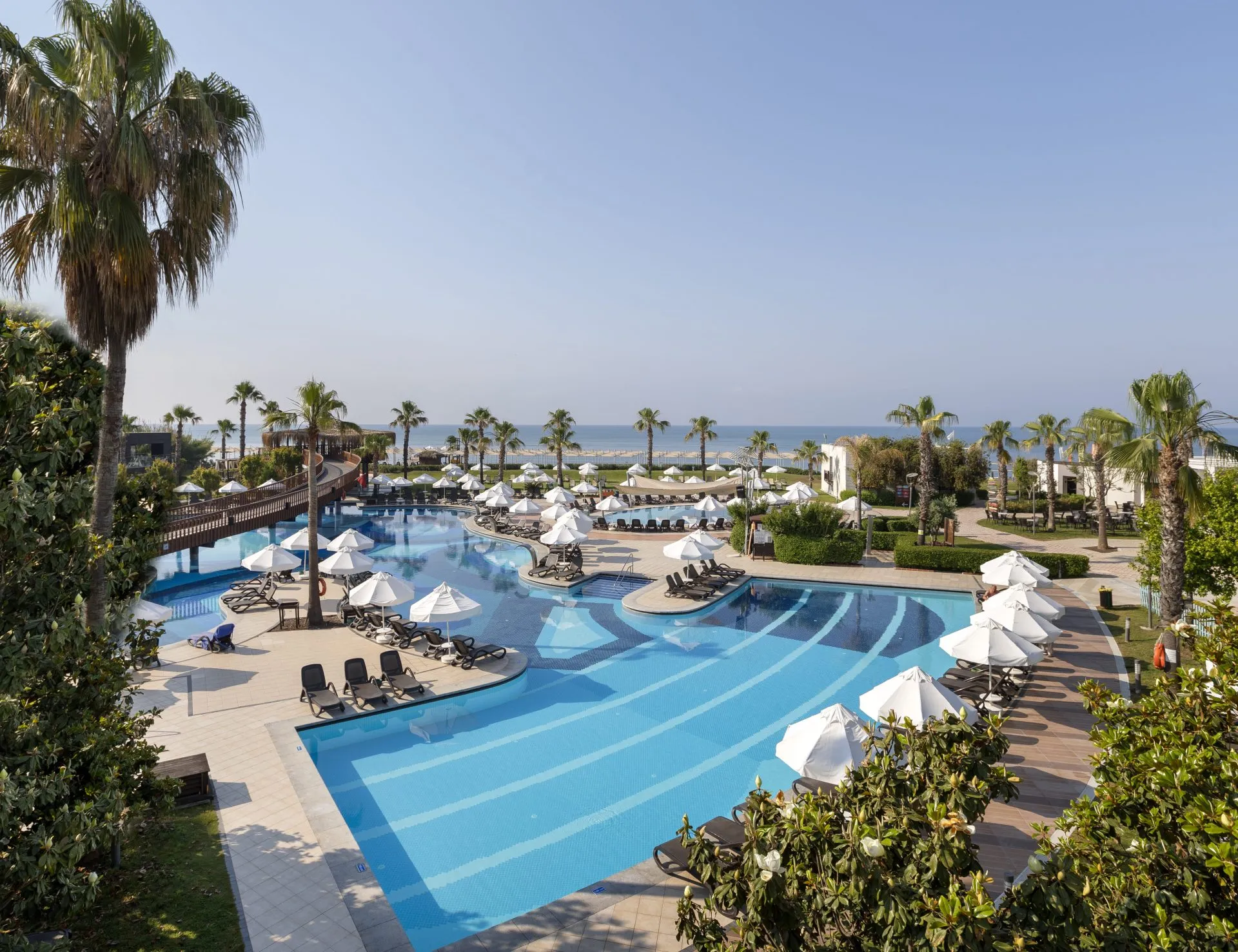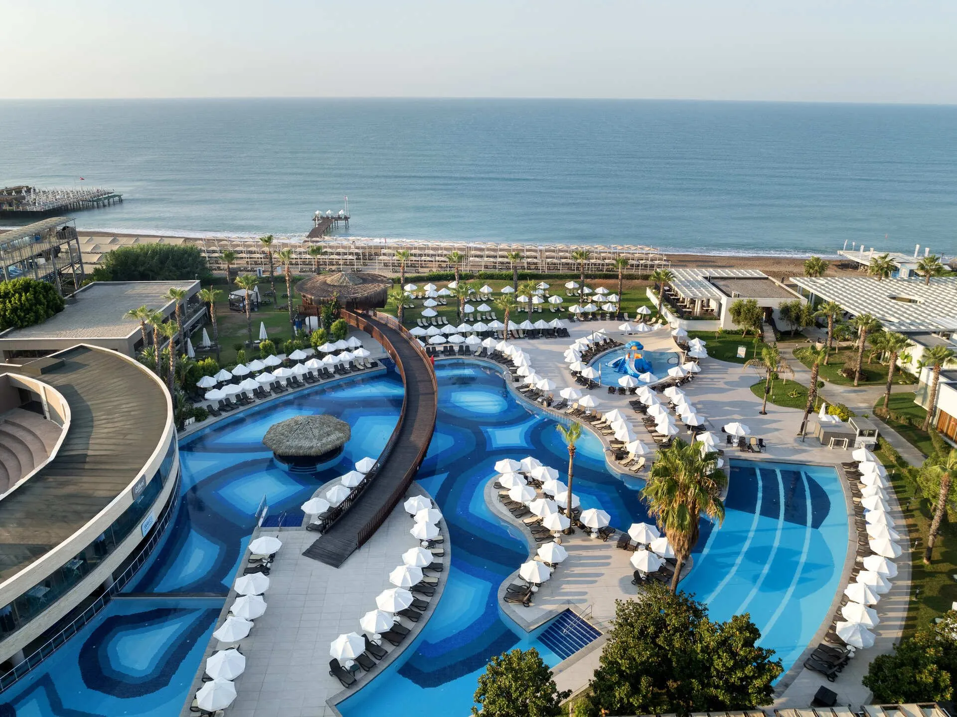 The apart hotel Sherwood Dreams Resort is located in the vicinity of a private sandy beach. The beach is awarded a blue flag. Here, there are sun loungers, cushions and beach towels available. Cold drinks are served at the beach bar. To reach the beach a shuttle is provided. The seasonally air-conditioned hotel has a 24h reception (check-in is possible around the clock), a lobby bar, Wi-Fi, internet access, a lift, a supermarket, a boutique, a hairdresser, a jacuzzi, a first aid kit, parking spaces as well as a TV lounge with satellite TV. In the outdoor area you will find a garden as well as a seasonally heated pool (open all year), where pool towels are available for free. For children there is also a separate children's pool with 2 water slides (type open slide). Furthermore, you can relax outdoors on a terrace. Inside the hotel you can use a heated indoor pool. You can store your valuables in the safe, and your luggage in the hotel`s storage room. For your entertainment, the hotel offers a theatre and a disco. For the young hotel guests there is a playground. For very young guests, kid`s chairs can also be provided. For the smallest children prams can be rented in the hotel. There is also a laundry service available at an additional cost to customers. Ironing equipment can be rented at the hotel for a fee. For your comfort, in addition to the concierge service the hotel page will ensure you are looked after. If necessary, you can contact the medical centre (for a fee). The energy supply is 220, 110, 120, 230 and 240 Volts. For conventions and other business meetings, the hotel offers a business centre as well as a conference area with a reception, printer, scanner as well as internet access. A photographer can also be ordered from the hotel for business events. If you want to explore the holiday region, you can use the car rental service close to the hotel (extra fee). For guests on their honeymoon, the hotel has special offers such as special honeymoon packages. In your hotel, a lot of focus is placed on sustainability. This includes the provision of soap, shampoo and lotion dispensers and a central room air-conditioning. That is why the hotel Sherwood Dreams Resort was also awarded a sustainability certificate. Euro/Master Card and Visa are accepted as means of payment. Due to its barrier-free facilities , such as barrier-free entrances, wheelchair accessible rooms and wheelchair-accessible bathrooms, the hotel is also suitable for wheelchair users. Catering As catering services the hotel offers all-inclusive and self-catering. Breakfast is offered continental or from the buffet. Enjoy your lunch from the buffet or as a set meal. Dinner is also served as a buffet. All Inclusive Light includes local alcoholic beverages. As part of the all-inclusive service, local and international alcoholic beverages (24h, unlimited) are available around the clock and at no extra charge. For the meals, there are a restaurant with terrace (Italian, calorie-reduced and gluten-free dishes) and several bars, a 24h snackbar as well as the pool bar. The drinks menu of the hotel includes 24h international alcoholic beverages. For dinner, guests are asked to wear appropriate clothing in the restaurant. Sports & Leisure To keep your fitness up on holiday, there is a gym for guests to use. A minigolf course offers fun for the family. At the beach, you can take advantage of various water sports. If you don`t want to miss out on training with a ball during your holidays, you`ll find a basketball court. During your holiday you can also take part in aerobics and Zumba courses. Those who want to practice archery will find facilities for this at the hotel. With beach volleyball and darts various other sports offer a lot of variety on holiday. A sauna and a wellness shower await you in the spa. The hotel also offers massages (extra fee) and beauty treatments (extra fee). Infants can be looked after in the hotel`s own baby club. For older children the care takes place in the children`s club. There is a babysitting service in the hotel, so that adults can also find some time to relax. The mini disco also offers age-appropriate entertainment for young hotel guests. Furthermore there is a youth club. In terms of adult entertainment, evening shows and live music are presented. Additional information The 4-storey hotel has a total of 304 rooms. Of these, 2 rooms have disabled access. This hotel is gay-friendly. The hotel staff speak English, German and Turkish.