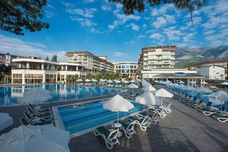 About 300 m from the hotel`s own beach is located the hotel Akra Kemer. The old town is around 49 km away. A supermarket is around 1,5 km away. On the beach are cushions, sun umbrellas and beach towels available. The hotel is equipped with a lobby bar, Wi-Fi, a supermarket and other shops, a hairdresser as well as parking spaces. In the outdoor area of the property you will find a pool that is open seasonally, where sun loungers and sun umbrellas are available for free. For children there is also a children's pool with a water slide. Inside the hotel you can use an indoor pool. For your entertainment, the hotel offers a disco. For very young guests, highchairs can be provided. For the smallest children prams can be rented in the hotel. There is also a laundry service available at an additional cost to customers. If necessary, you can contact the medical centre (for a fee). If you want to explore the holiday region, you can use the car rental service close to the hotel (extra fee). Catering Breakfast is offered from the buffet. Lunch and dinner are also served from the buffet. When booking all-inclusive, one meal in the à la carte restaurant is included. Your physical well-being is catered for by the pool bar. Appropriate clothing is required for lunch and dinner. Distances