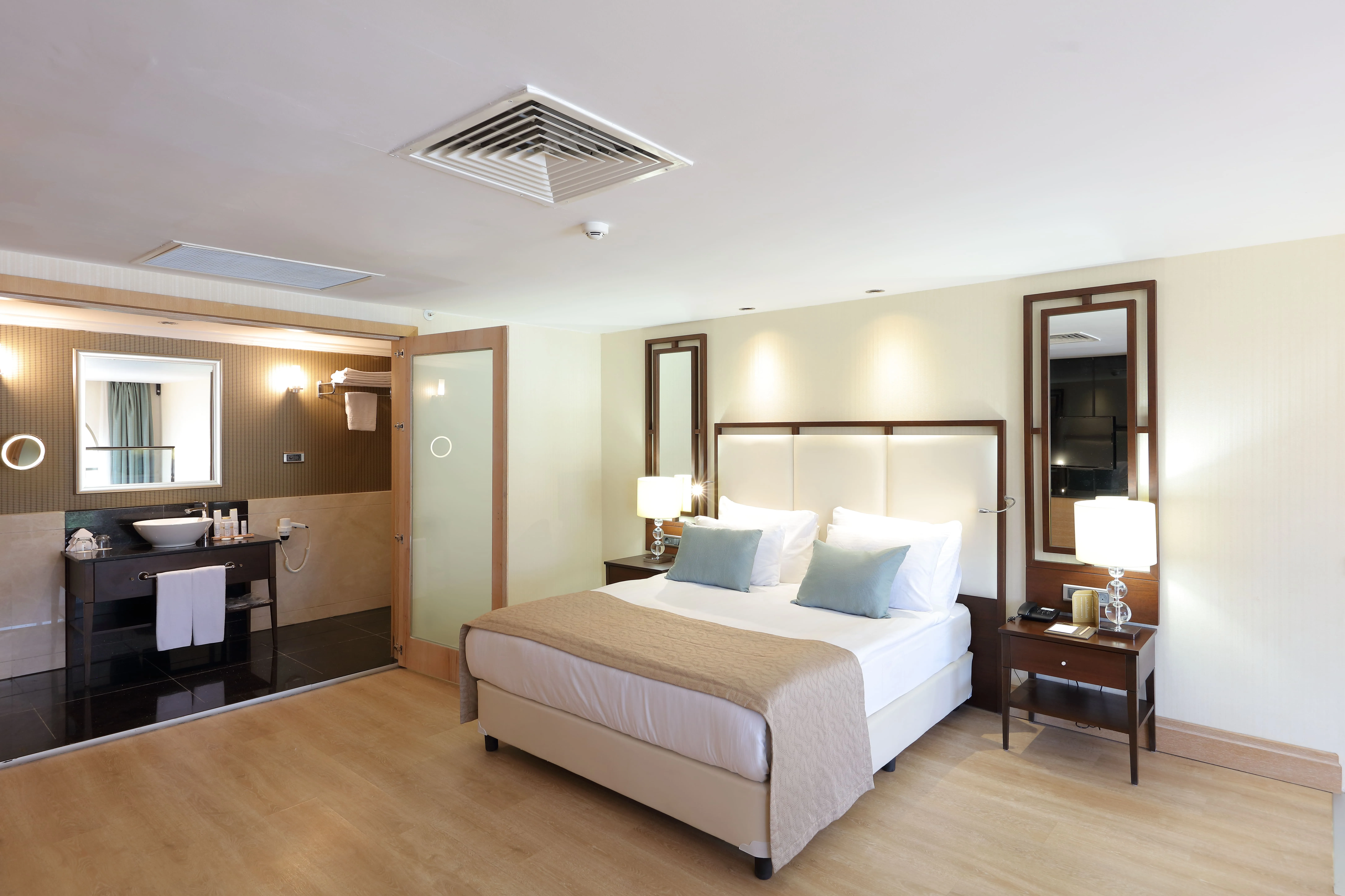 In the vicinity of the hotel`s own sandy/pebble beach lies the aparthotel Amara Premier Palace Hotel. There is a shuttle between the hotel and the airport (for a fee). The beach is awarded a blue flag. Here, there are sun loungers, cushions and beach towels available. At the beach there is a bar serving refreshing drinks. The seasonally air-conditioned, GPS-verified hotel is equipped with a 24h reception (check-in is possible around the clock), a lobby bar, Wi-Fi, internet access, a lift, a supermarket and other shops, a boutique, a hairdresser, a first aid kit, parking spaces (limited) as well as a TV lounge with satellite TV. In the outdoor area you will find a garden as well as a seasonally heated pool (open all year), where pool towels are available for free. For children there is also a separate and an integrated children's pool with 7 water slides (type open slide). Furthermore, you can relax outdoors on a terrace. Inside the hotel you can use a heated indoor pool. You can store your valuables in the safe, and your luggage in the hotel`s storage room. In addition, the hotel Amara Premier Palace Hotel is video-monitored 24h a day. For your entertainment, the hotel offers a library/reading room and a disco. For the young hotel guests there is a playground. For very young guests, kid`s chairs can also be provided. For the smallest children prams can be rented in the hotel. There is also a laundry service available at an additional cost to customers. Ironing equipment can be rented at the hotel for a fee. For your comfort the hotel page will ensure you are looked after. If necessary, you can contact the medical centre at any time (for a fee). The energy supply is 220 Volts. For conventions and other business meetings, the hotel offers a business centre as well as a (auditorium-style) conference area with lectern, tables, a video projector, printer, scanner, overhead projector as well as internet access. A photographer can also be ordered from the hotel for business events. If you want to explore the holiday region, you can use the car rental service close to the hotel (extra fee). For guests on their honeymoon, the hotel has special offers such as a romantically-decorated room, rooms with a particularly romantic location and view, special honeymoon packages, romantic dishes in the restaurant or a basket of fruit in the room. In your hotel, a lot of focus is placed on sustainability. This includes waste segregation in the rooms, the hotel`s own recycling bins, the provision of soap, shampoo and lotion dispensers and organic food. Euro/Master Card and Visa are accepted as means of payment. Due to its barrier-free facilities , such as a revolving door in the entrance area, an automatic hotel door, a hotel door that can be opened manually, barrier-free entrances, wheelchair accessible rooms, a handrail in the elevator and wheelchair-accessible bathrooms, the hotel is also suitable for wheelchair users. Catering Breakfast is offered continental or from the buffet. Enjoy your lunch from the buffet. Dinner is also served as a buffet or à la carte. As part of the all-inclusive service, local and international alcoholic beverages (24h) are available around the clock and at no extra charge. For the meals, there are a restaurant with terrace (Italian, calorie-reduced and gluten-free dishes) and several bars, a 24h snackbar as well as the pool bar. The drinks menu of the hotel includes 24h international alcoholic beverages. Distances