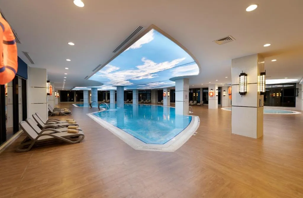 Plajă proprie cu nisip și pietriș, lungime: 100 metri, distincția „Blue Flag”; Aqua Park cu 11 tobogane; Piscina principală – 1.200 mp, piscină semi-olimpică – 312 mp, piscină cu valuri – 714 mp, piscină Relax +18 – 165 mp, piscină pentru copii – 120 mp, piscină interioară – 200 mp, piscină interioară pentru copii – 24 mp; Șezlonguri, saltele, umbrele și prosoape gratuite atât la plajă, cât și la piscină.