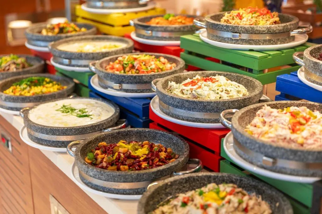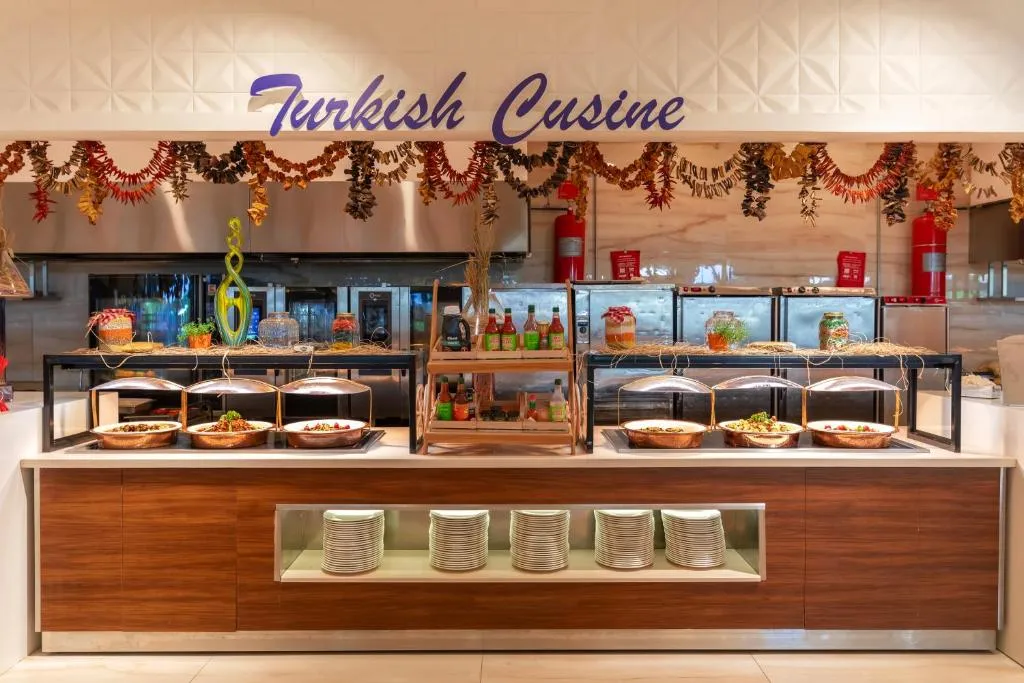 Restaurant principal cu bufet separat pentru copii; 3 restaurante a la carte cu specific turcesc, italian (o cina gratuita la alergere intre cele doua) si pescaresc (contra cost); snack baruri; 9 baruri si cafenele: Lobby Bar, Pool Bar, Beach Bar, Beer Garden, Coffee&Patisserie, Detox Bar (contra cost), Arena Bar, Disco Bar, Crystal Coffee.