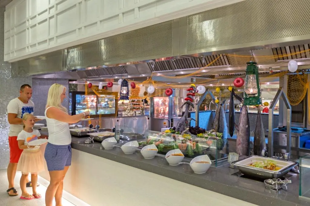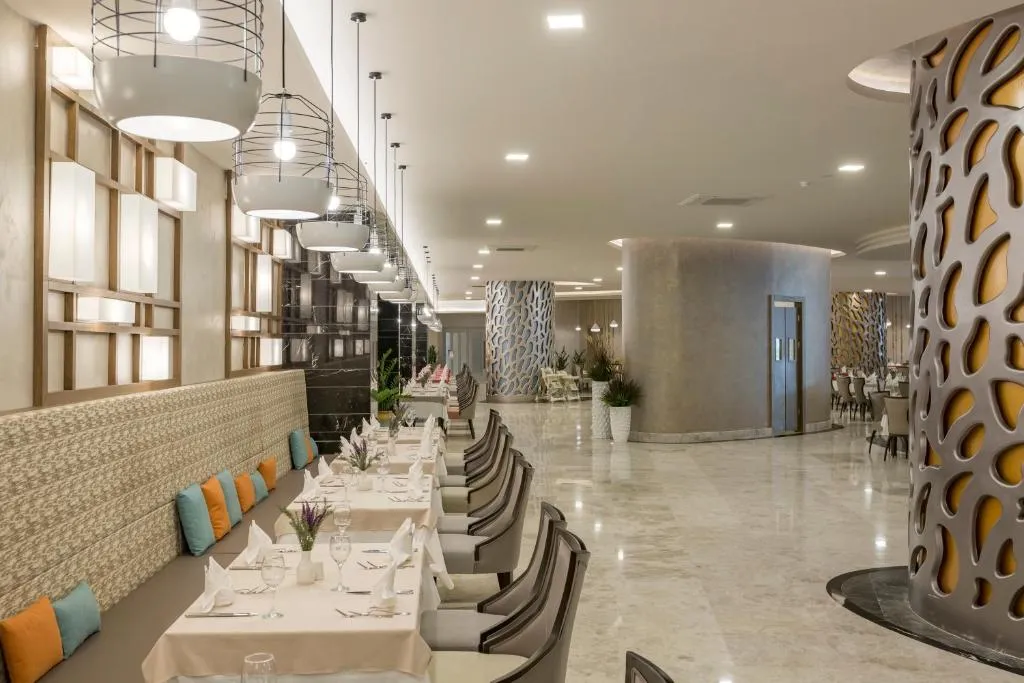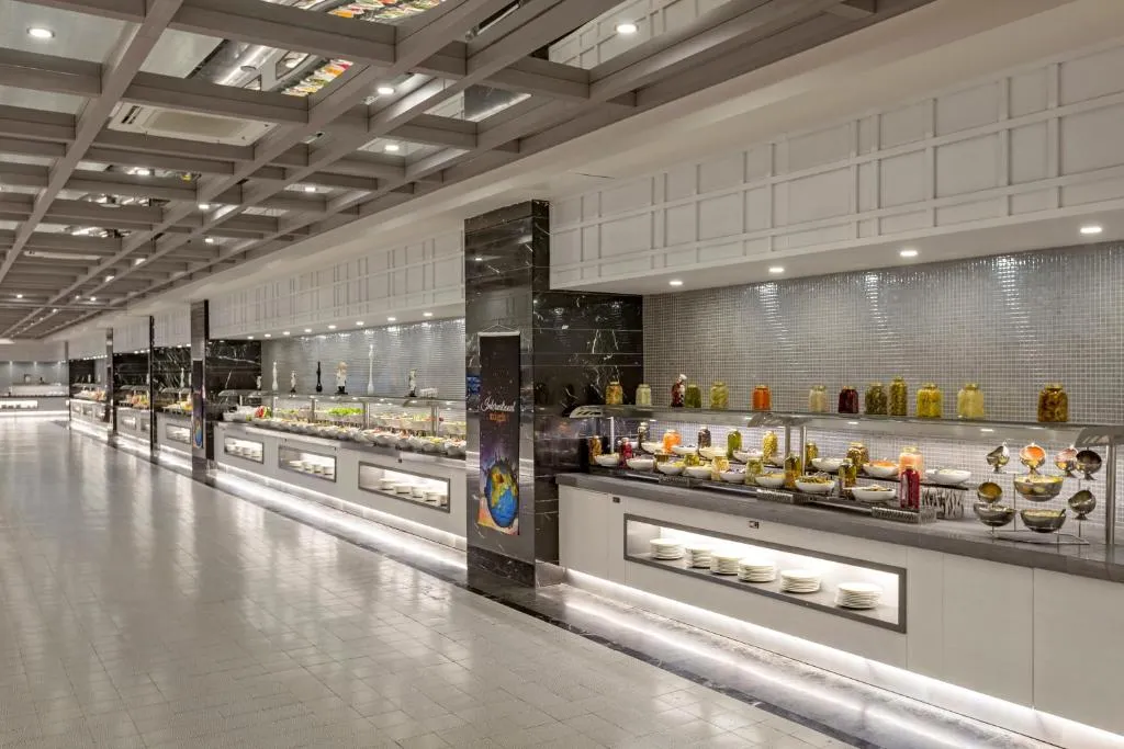 Restaurant principal; restaurant pentru copii; Snack Restaurant; Bistro & Patisserie; 8 restaurante á la carte: Seafood Restaurant, Italian Restaurant, Turkish Restaurant, Steak Restaurant, Fareast Restaurant, Sushi Restaurant, Mexican Restaurant, Tapas Restaurant; Food Corners (mini restaurante cu: îngheţată, cafea & prăjituri, toast, kebab, cartofi copţi, pizza, desert, sandwich-uri, fructe); 2 Lobby Bars, Pool Bar, Pier Bar, Terrace Bar, Snack Bar, Amphi Bar, Disco Bar, Café Turk