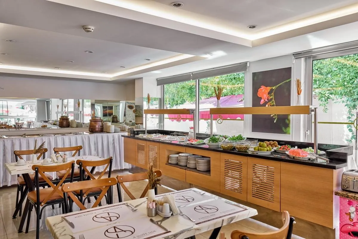 Descriere generală În apropierea unei plaje private cu nisip se află hotelul A Hotel Side. Pe plajă sunt disponibile gratuit șezlonguri și umbrele de soare. Orașul Side este la aprox. 500 m (Manavgat cca. 2 km). Magazinele sunt la aprox. 500 m de hotel, și veți găsi un supermarket la cca. 2 km. De asemenea, cele mai apropiate baruri și restaurante sunt la cca. 2 km. O discotecă aflată la aprox. 2 km vă invită la dans. Alte facilități de divertisment cum ar fi un cinematograf și un teatru se află la aprox. 2 km. Următoarele atracții pot fi accesate de la hotel: Ancient Side (cca. 2 km) și Beskonak (cca. 30 km). Hotelul dispune de serviciu de rentacar. De asemenea, aveți în apropiere o stație de autobuz și o stație de taxi (cca. 200 m) cea ce vă oferă mobilitate în timpul vacanței. Pentru îngrijiri medicale în caz de urgență, există un spital la cca. 400 m distanță. Există un serviciu de transfer între hotel și aeroport (la un cost suplimentar). Până la cea mai apropiată plajă există, de asemenea, un serviciu de transfer (graduit). Facilități Încântătorul hotel, care a fost renovat parțial în 2022, dispune de 3 etaje și peste 48 camere. Hotelul are recepție deschisă 24h (check-in de la 14:00, check out până la 12:00), lobby și aer condiționat. Accesul la internet WiFi este disponibil gratuit pentru oaspeții hotelului. Serviciul de menaj este gratuit. Spălătorie, călcat și serviciul medical sunt disponibile la un cost suplimentar. Piscină În grădinile acestui hotelul există o piscină cu apă dulce precum și o piscină separată pentru copii. Acolo sunt disponibile gratuit șezlonguri și umbrele de soare. La barul de la piscină sunt disponibile băuturi răcoritoare (deschis între orele 08:00 - 23:00). Catering Mic dejun american (între orele 07:00 - 10:00). Sport/Leisure Există serviciu de închiriere de biciclete. Informații suplimentare Pentru anumite facilități sau activități se pot aplica taxe suplimentare. Unele servicii depind de anotimp și de condițiile climatice locale. Limba de serviciu: engleză. Unele servicii sau oferte pot fi utilizate doar într-o măsură limitată sau pot fi complet închise din cauza noilor protocoale de sănătate COVID19. Se pot aplica modificări fără informare prealabilă. Etagenbett Standard Familienzimmer (Balkon): Cameră cu pardoseală cu gresie, ceainic (gratuit), minibar (contra cost), acces la internet (gratuit), seif (contra cost) și TV cu ecran plat prin satelit precum și aer condiționat reglabil individual. Baie cu duș. Prosoapele se schimbă zilnic, lenjeria de pat de 2 ori pe săptămână. Grosses Zimmer: Dotate cu pardoseală cu gresie, ceainic (gratuit), minibar (contra cost), acces la internet (gratuit), seif (contra cost) și TV cu ecran plat prin satelit precum și aer condiționat reglabil individual. Baie cu duș. Prosoapele se schimbă zilnic, lenjeria de pat de 2 ori pe săptămână. Grosses Zimmer (Balkon): Cameră cu pardoseală cu gresie, ceainic (gratuit), minibar (contra cost), acces la internet (gratuit), seif (contra cost) și TV cu ecran plat prin satelit precum și aer condiționat reglabil individual. Baie cu duș. Prosoapele se schimbă zilnic, lenjeria de pat de 2 ori pe săptămână. Standard Zimmer: Cameră cu pardoseală cu gresie, ceainic (gratuit), minibar (contra cost), acces la internet (gratuit), seif (contra cost) și TV cu ecran plat prin satelit precum și aer condiționat reglabil individual. Baie cu duș. Prosoapele se schimbă zilnic, lenjeria de pat de 2 ori pe săptămână. Einzelbelegung Standard Zimmer: Dotate cu pardoseală cu gresie, ceainic (gratuit), minibar (contra cost), acces la internet (gratuit), seif (contra cost) și TV cu ecran plat prin satelit precum și aer condiționat reglabil individual. Baie cu duș. Prosoapele se schimbă zilnic, lenjeria de pat de 2 ori pe săptămână.