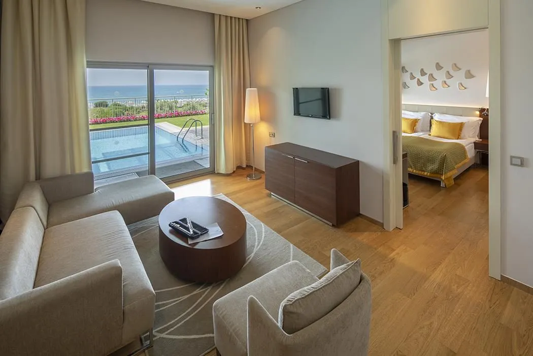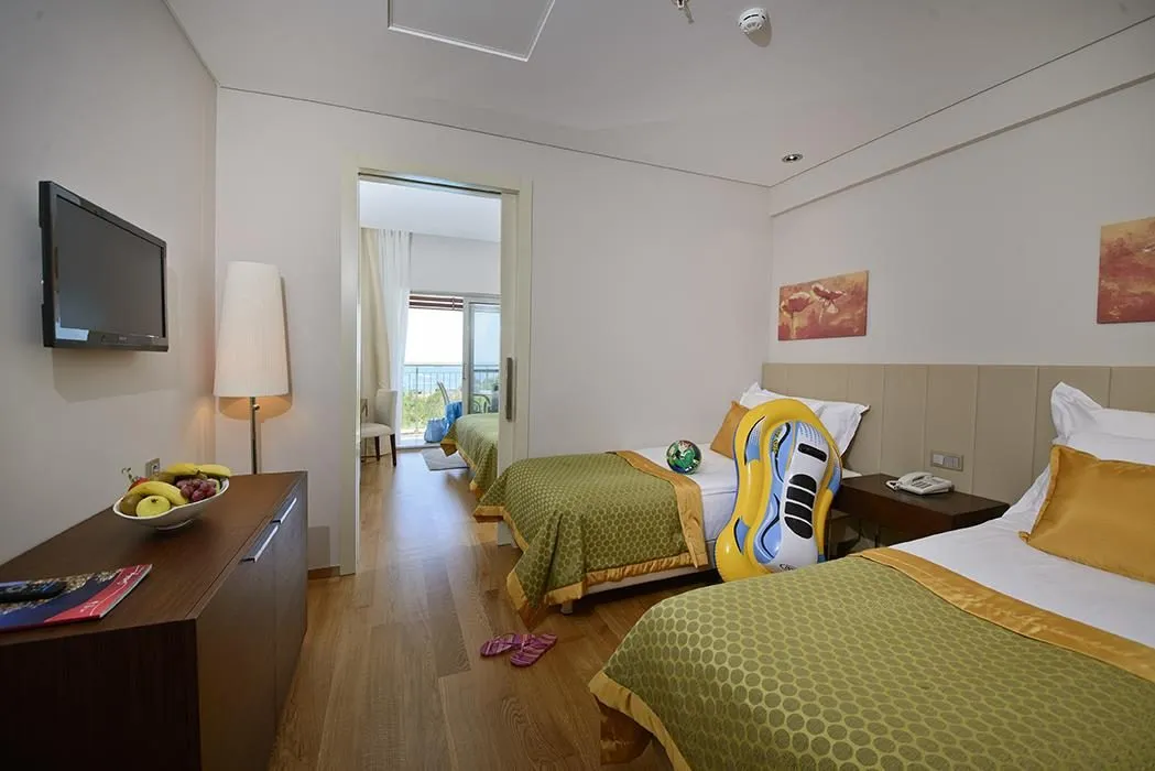 - 4 Superior Sea View Family Rooms with pool access- au o suprafata de 48 mp si o capacitate de cazare de cel mult 5 persoane. Acest tip de camera este compus din doua dormitoare (un pat dublu, doua paturi single si o canapea extensibila) si o baie.