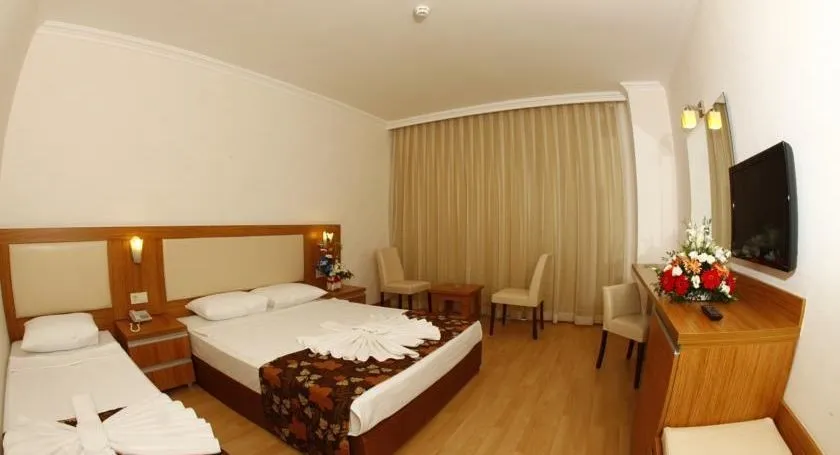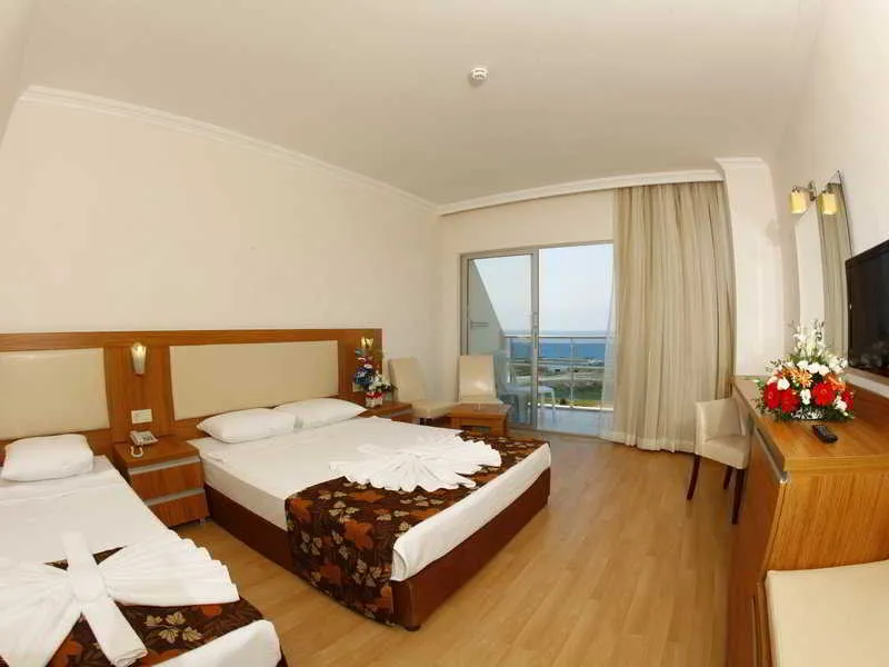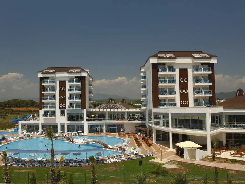 This holiday hotel is located frontline to the fine sandy private beach on the coastline between Manavgat and Alanya in the Kizilot district. Manavgat is 15 km away, the historical town of Side with its ancient sites 20 km. Antalya Airport is at a distance of 90 km. The hotel features 268 rooms, 24-hours reception, meeting rooms, free WIFI in public areas, 3 restaurants, 4 bars, fitness centre, spa and wellness, outdoor and indoor pool, children's pool, playground, shops, sports facilities, car hire and free on-site parking. Location:2011 Year of construction; 268 Total number of rooms; 5 Number of floors (main building); 198 Double rooms; 3 Disability-friendly rooms Hotel type:hotel Methods of payment:MasterCard; Visa Distances (in meters):City centre (3000); Nearest Bus / Metro Stop (15000); Beach (200) Facilities:Wheelchair-accessible; Car park; 24-hour reception; Check-in hour; Check-out hour; Wired Internet (Extra Fee); Wi-fi; Airport Shuttle; Room service (Extra Fee); Laundry service (Extra Fee); Medical service (Extra Fee); Bicycle hire service; Babysitting service; Bellboy service; Air conditioning in public areas; Hotel safe; Lift access; Shop; Garden; Terrace; Sun terrace; Gym; Luggage room; Clothes dryer; Private beach area; Library Catering:Bar; 3 Restaurant; Non-smoking area; Smoking area; Poolside snack bar; Air conditioning in Restaurant Business:Conference room; Meeting room Entertainment:1 Indoor freshwater pool; 2 Outdoor freshwater pool; 1 Children’s swimming area; Sun loungers; Parasols; Kids’ club; Entertainment programme for adults; Entertainment programme for children; Theatre / auditorium; Game room; Nightclub Health:Sauna; Steam bath; Turkish bath (hamam); Massage (Extra Fee); Spa treatments (Extra Fee); Hairdressing salon