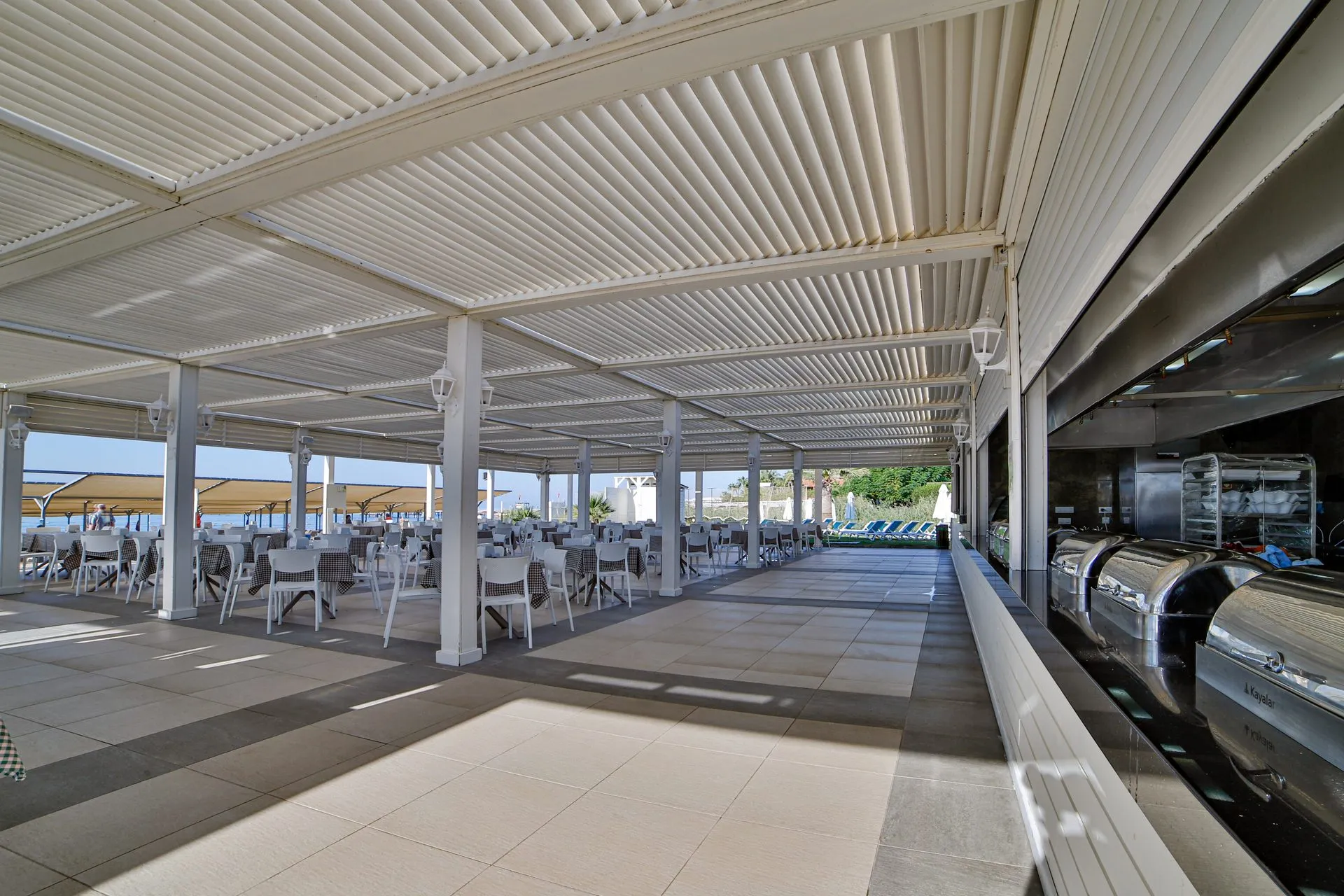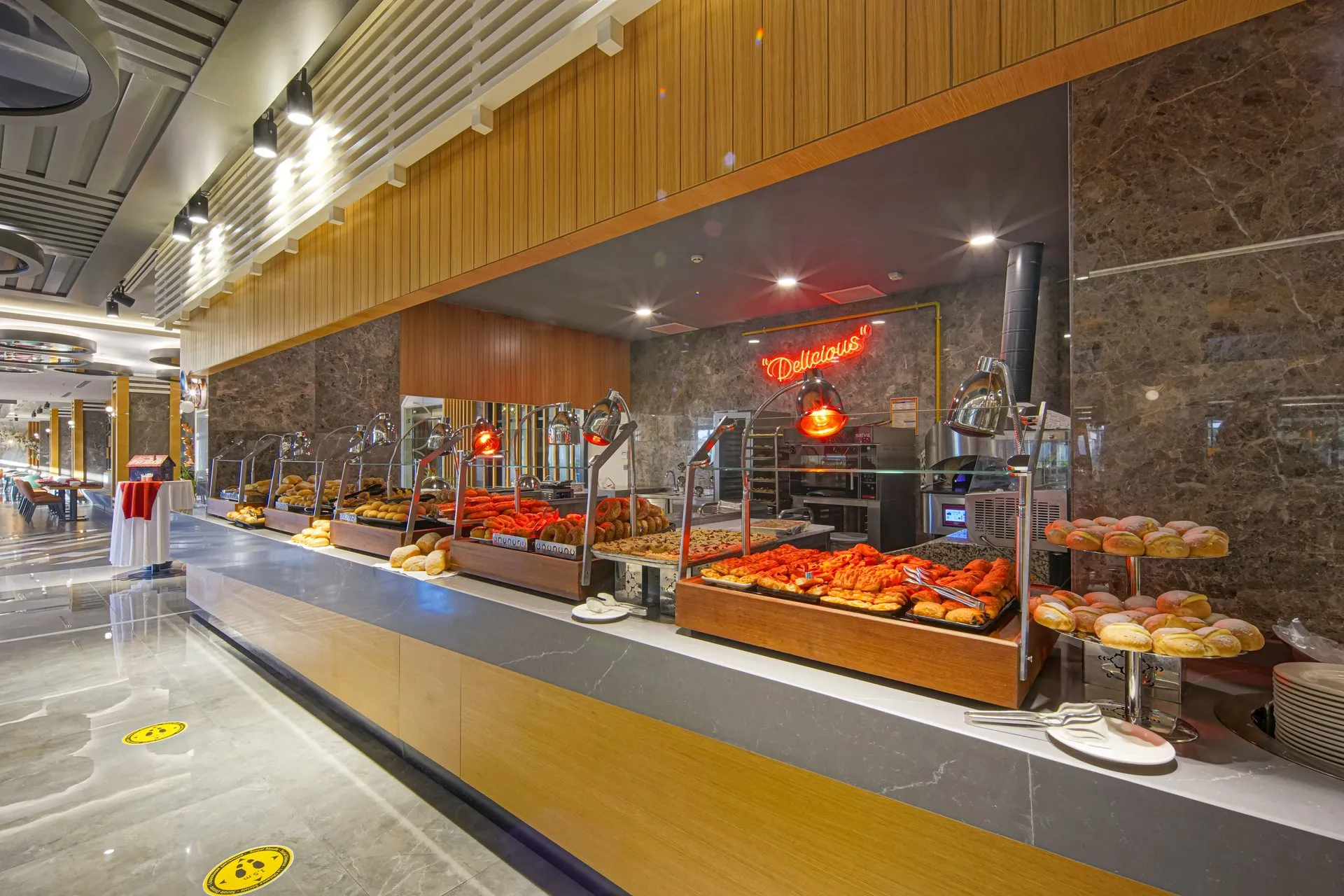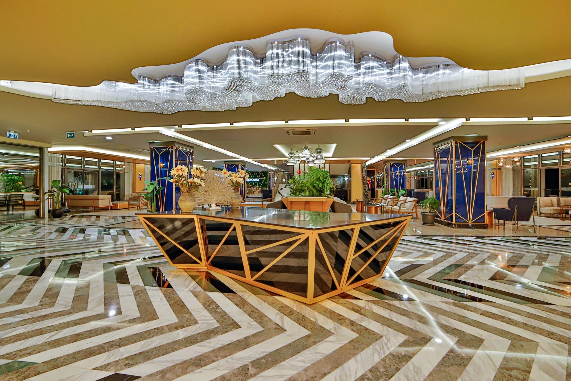 In the vicinity of the hotel`s own beach is located the hotel Diamond De Luxe Hotel & Spa. The nearest shops you can reach within around 300 m. There is a shuttle between the hotel and the airport (for a fee). On the beach are sun loungers and beach towels available. At the beach there is a bar serving refreshing drinks. The air-conditioned hotel has a 24h reception (check-in is possible around the clock), a lobby bar, Wi-Fi, internet access, a lift, a shop, a boutique as well as a hairdresser. In the outdoor area of the property you will find a heated pool, where pool towels are available for free. There is also a separate children's pool with 5 water slides. Furthermore, you can relax outdoors on a terrace. Inside the hotel you can use an indoor pool. You can store your valuables in the safe, and your luggage in the hotel`s storage room. For your entertainment, the hotel offers a disco. For very young guests, kid`s chairs can be provided. There is also a laundry service available at an additional cost to customers. Ironing equipment can be rented at the hotel for a fee. For your comfort the hotel page will ensure you are looked after. If necessary, you can contact the medical centre at any time. Guests at the accommodation can get a wake-up call from the hotel personnel. For conventions and other business meetings, the hotel offers a business centre as well as a conference area with scanner as well as overhead projector. If you want to explore the holiday region, you can use the car and motorbike rental service close to the hotel (extra fee). At the reception, tickets are offered for excursions in the area. In your hotel, a lot of focus is placed on sustainability. This includes among others a central room air-conditioning. That is why the hotel Diamond De Luxe Hotel & Spa was also awarded a sustainability certificate. Due to its barrier-free facilities , such as separate, barrier-free entrances, wheelchair accessible rooms and a wheelchair accessible lift, the hotel is also suitable for wheelchair users. Catering As catering services the hotel offers all-inclusive, full board and full board plus. Breakfast is offered from the buffet. Enjoy your lunch from the buffet. Dinner is also served as a buffet or à la carte. Half board plus includes selected imported spirits (limited). All Inclusive Light includes local alcoholic beverages. As part of the all-inclusive service, local and international alcoholic beverages (24h, limited) as well as international alcoholic beverages (unlimited) are available at no extra charge. For the meals, there are a buffet restaurant with terrace (Italian, Mediterranean and calorie-reduced dishes) and several bars as well as the pool bar. The drinks menu of the hotel includes 24h international alcoholic beverages. For dinner, guests are asked to wear appropriate clothing in the restaurant. Distances