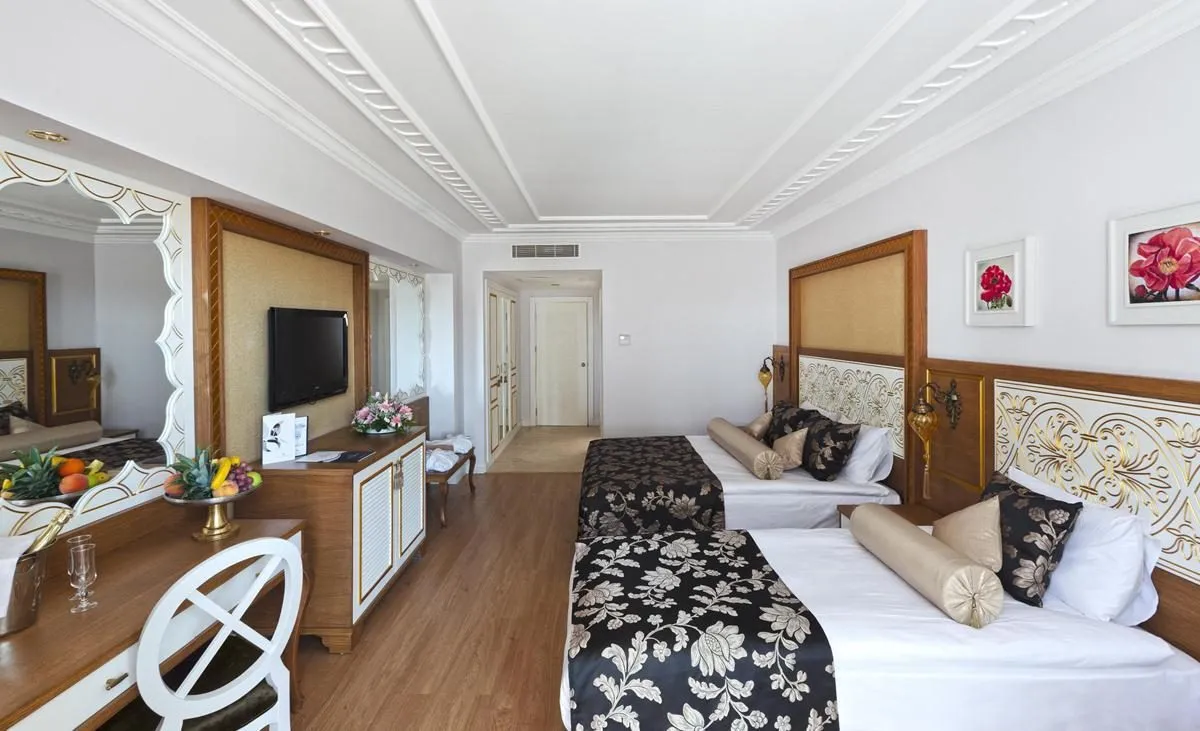 Descriere generală La doar câțiva pași de o plajă privată cu nisip se găsește hotelul Crystal Palace (ex. Crystal Palace Luxury Resort And Spa). Pe plajă sunt disponibile gratuit șezlonguri și umbrele de soare. Orașul Antalya este la aprox. 60 km. Locul de cazare are la dispoziție mașini de închiriat. Aeroportul (AYT) se află la aprox. 53 km. Un alt aeroport (GZP) este la cca. 118 km. Facilități Resortul dispune de 5 etaje și peste 509 camere repartizate între o clădire principală și de 5 clădiri secundare. Acesta oferă oaspeților săi recepție deschisă 24h (check-in de la 14:00, check out până la 12:00), lobby cu bar, aer condiționat, minimarket, alte magazine, cinematograf și parcare (gratuită). Accesul la internet WiFi este disponibil gratuit pentru oaspeții hotelului. În plus, hotelul oferă o zonă de conferințe. Serviciul de menaj este gratuit. Room service, spălătorie, călcat și serviciul medical sunt disponibile la un cost suplimentar. Piscină În grădinile acestui hotelul există 2 piscine cu apă dulce precum și o piscină separată pentru copii și un tobogan de apă. La piscine sunt disponibile gratuit șezlonguri și umbrele de soare. La barul de la piscină sunt disponibile băuturi răcoritoare (deschis între orele 10:00 - 23:00). Catering Mic dejun (între orele 07:00 - 11:00) bufet suedez. All Inclusive: micul dejun, prânzul și cina. Micul dejun, prânzul și cina pot fi servite numai în anumite restaurante. Sunt disponibile și meniuri pentru copii. Apă, băuturi răcoritoare, cafea și ceai, bere, vin și băuturi alcoolice naționale. Băutură de bun venit, prăjituri și produse de patiserie (11:00 - 22:00), aperitive (11:00 - 18:00), anumite băuturi alcoolice importate (între orele 10:00 - 23:59, limitate în anumite restaurante sau baruri), gustări la miezul nopții (21:30 - 07:00), internet gratuit și minibar gratuit în cameră (limitat). Sport/Leisure Oferte pentru sport și divertisment: Fitness, tenis de masă (gratuit), volei pe plajă, darts (gratuit), tenis (gratuit), aerobic și baschet. Pe plajă puteți practica sporturi nautice precum jet ski (unele de către furnizori locali). Există serviciu de închiriere de biciclete. Oferte de wellness: Saună, baie turcească și hamam gratuite. Zonă de spa și masaje contra cost. Divertisment pentru adulți: spectacole de seară și muzică live. Copiii vor găsi un loc de joacă în exteriorul hotelului. Îngrijirea copiilor: program de animație pentru copii (de la 4 - 12 ani) și mini club pentru copii (de la 4 - 12 ani). Sală de jocuri. Informații suplimentare Pentru anumite facilități sau activități se pot aplica taxe suplimentare. Unele servicii depind de anotimp și de condițiile climatice locale. Limbi de serviciu: engleză, germană și turcă. Carduri de credit: Visa și Euro/MasterCard. 2 Schlafzimmer Standard Familienzimmer: Cameră cu pat pentru bebeluși (gratuit), parchet laminat, încălzire controlată centralizat, ceainic (gratuit), minibar (gratuit), acces la internet (gratuit), seif (gratuit) și TV cu ecran plat prin satelit precum și aer condiționat controlat central. Baie cu duș. Standard JuniorSuite (Seitlicher Meerblick): Cameră cu pat pentru bebeluși (gratuit), parchet laminat, încălzire controlată centralizat, ceainic (gratuit), minibar (gratuit), acces la internet (gratuit), seif (gratuit) și TV cu ecran plat prin satelit precum și aer condiționat controlat central. Baie cu duș. Einzel Standard JuniorSuite: Dotate cu pat pentru bebeluși (gratuit), parchet laminat, încălzire controlată centralizat, ceainic (gratuit), minibar (gratuit), acces la internet (gratuit), seif (gratuit) și TV cu ecran plat prin satelit precum și aer condiționat controlat central. Baie cu duș. Standard Zimmer (Meerblick): Dotate cu pat pentru bebeluși (gratuit), parchet laminat, încălzire controlată centralizat, ceainic (gratuit), minibar (gratuit), acces la internet (gratuit), seif (gratuit) și TV cu ecran plat prin satelit precum și aer condiționat controlat central. Baie cu duș. Doppelt Standard Zimmer: Dotate cu pat pentru bebeluși (gratuit), parchet laminat, încălzire controlată centralizat, ceainic (gratuit), minibar (gratuit), acces la internet (gratuit), seif (gratuit) și TV cu ecran plat prin satelit precum și aer condiționat controlat central. Baie cu duș. Dimensiune: 22 m². Doppelt Standard Zimmer (Economy): Dotate cu pat pentru bebeluși (gratuit), parchet laminat, încălzire controlată centralizat, ceainic (gratuit), minibar (gratuit), acces la internet (gratuit), seif (gratuit) și TV cu ecran plat prin satelit precum și aer condiționat controlat central. Baie cu duș. Doppelt Standard Zimmer (Seitlicher Meerblick): Cameră cu pat pentru bebeluși (gratuit), parchet laminat, încălzire controlată centralizat, ceainic (gratuit), minibar (gratuit), acces la internet (gratuit), seif (gratuit) și TV cu ecran plat prin satelit precum și aer condiționat controlat central. Baie cu duș. Doppelt Standard Zimmer (Meerblick): Dotate cu pat pentru bebeluși (gratuit), parchet laminat, încălzire controlată centralizat, ceainic (gratuit), minibar (gratuit), acces la internet (gratuit), seif (gratuit) și TV cu ecran plat prin satelit precum și aer condiționat controlat central. Baie cu duș. Einzelbelegung Standard Zimmer: Cameră cu pat pentru bebeluși (gratuit), parchet laminat, încălzire controlată centralizat, ceainic (gratuit), minibar (gratuit), acces la internet (gratuit), seif (gratuit) și TV cu ecran plat prin satelit precum și aer condiționat controlat central. Baie cu duș. Einzelbelegung Standard Zimmer (Seitlicher Meerblick): Cameră cu pat pentru bebeluși (gratuit), parchet laminat, încălzire controlată centralizat, ceainic (gratuit), minibar (gratuit), acces la internet (gratuit), seif (gratuit) și TV cu ecran plat prin satelit precum și aer condiționat controlat central.