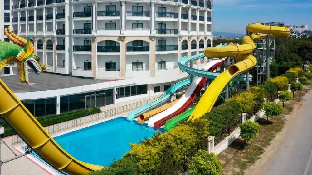 Piscină principală-1600 mp, piscină interioară-160mp, piscină exterioară pentru copii- 160 mp, piscină interioară pentru copii-20 mp, piscină cu 6 tobogane-180 mp;