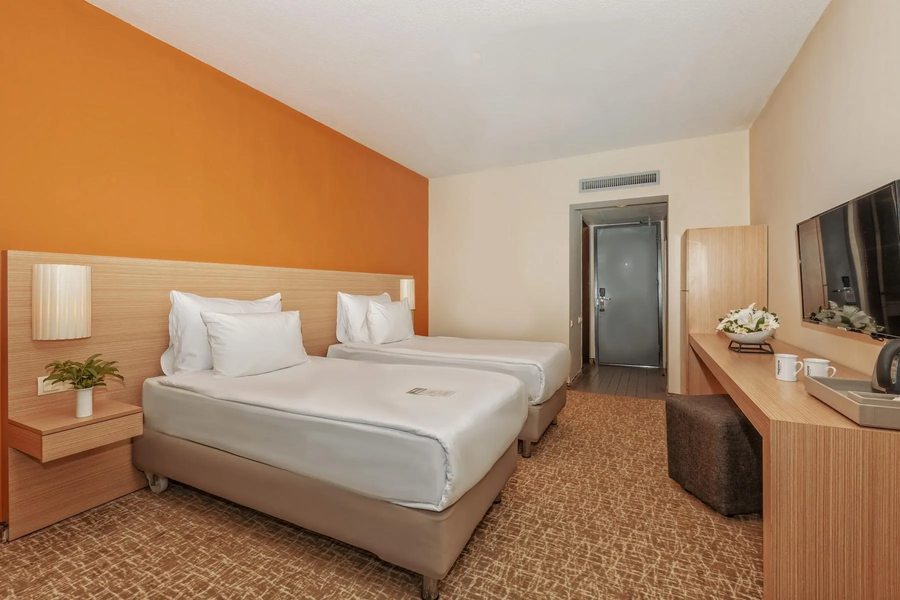 Descriere generală Hotelul Megasaray Resort Side (Ex: Aska Side Grand Prestige) este situat direct pe o plajă privată cu nisip. Pe plajă sunt disponibile gratuit șezlonguri și umbrele de soare. Centrul turistic al stațiunii se află la aprox. 7 km. Orașul Antalya este la aprox. 80 km (Side cca. 7 km, Manavgat cca. 6 km). Cele mai apropiate baruri și restaurante sunt la cca. 7 km distanță. O discotecă aflată la aprox. 7 km vă invită la dans. Hotelul dispune de serviciu de rentacar. Pentru îngrijiri medicale în caz de urgență, există un spital la cca. 6 km distanță. Aeroportul (AYT) se află la aprox. 70 km. Un alt aeroport (GZP) este la cca. 105 km. Facilități Încântătorul hotel, care a fost renovat în 2023, dispune de 6 etaje și peste 347 camere. Acesta oferă oaspeților săi recepție deschisă 24h (check-in de la 15:00, check out până la 11:00), lobby cu bar, un total de 6 lifturi, aer condiționat, minimarket, alte magazine, discotecă (deschis între orele 23:30 - 02:00) și parcare (gratuită). Pentru a servi masa vă stau la dispoziție 5 restaurante cu aer condiționat și un snackbar. Accesul la internet WiFi este disponibil gratuit pentru oaspeții hotelului. Pentru evenimente de afaceri, hotelul oferă o zonă de conferințe cu acces la internet. Serviciul de menaj este gratuit. Room service, spălătorie, călcat și serviciul medical sunt disponibile la un cost suplimentar. Piscină În grădinile acestui hotelul există o piscină cu apă dulce precum și o piscină separată pentru copii și un tobogan de apă. La piscină sunt disponibile gratuit șezlonguri și umbrele de soare. La barul de la piscină sunt disponibile băuturi răcoritoare (deschis între orele 08:30 - 00:00). Catering Mic dejun (între orele 07:00 - 10:30) bufet suedez. All Inclusive: micul dejun, prânzul și cina. Micul dejun, prânzul și cina pot fi servite numai în anumite restaurante. Apă. Mic dejun târziu (între orele 10:00 - 10:30), băuturi răcoritoare (10:00 - 00:00), cafea și ceai (10:00 - 00:00), prăjituri și produse de patiserie (16:00 - 17:00), aperitive (12:00 - 16:00), bere (10:00 - 00:00), vin (10:00 - 00:00), băuturi alcoolice naționale (10:00 - 00:00) și gustări la miezul nopții (23:00 - 00:00). Sport/Leisure Oferte pentru sport și divertisment: Tenis de masă (gratuit), yoga, fitness, tenis (gratuit), volei pe plajă și darts (gratuit). Există serviciu de închiriere de biciclete. Oferte de wellness: Saună și hamam gratuite. Zonă de spa și masaje contra cost. Divertisment pentru adulți: muzică live. Pentru distracția celor mici există un loc de joacă. Îngrijirea copiilor: mini club. Sală de jocuri. Informații suplimentare Pentru anumite facilități sau activități se pot aplica taxe suplimentare. Unele servicii depind de anotimp și de condițiile climatice locale. Limbi de serviciu: engleză, germană, franceză, rusă și turcă. Carduri de credit: Visa și Euro/MasterCard. Familien-Junior-Suite: Dotate cu mochetă, încălzire controlată centralizat, minibar (gratuit), balcon, acces la internet (gratuit), seif (gratuit) și TV cu ecran plat prin satelit precum și aer condiționat controlat central. Baie cu duș. Prosoapele și lenjeria de pat se schimbă de 2 ori pe săptămână. Familienzimmer (Balkon oder Terrasse): Dotate cu mochetă, încălzire controlată centralizat, minibar (gratuit), balcon, acces la internet (gratuit), seif (gratuit) și TV cu ecran plat prin satelit precum și aer condiționat controlat central. Baie cu duș. Prosoapele și lenjeria de pat se schimbă de 2 ori pe săptămână. Familienzimmer (Terrasse): Cameră cu mochetă, încălzire controlată centralizat, minibar (gratuit), balcon, acces la internet (gratuit), seif (gratuit) și TV cu ecran plat prin satelit precum și aer condiționat controlat central. Baie cu duș. Prosoapele și lenjeria de pat se schimbă de 2 ori pe săptămână. Etagenbett Standard Familienzimmer (Landschaftsblick): Dotate cu mochetă, încălzire controlată centralizat, minibar (gratuit), balcon, acces la internet (gratuit), seif (gratuit) și TV cu ecran plat prin satelit precum și aer condiționat controlat central. Baie cu duș. Prosoapele și lenjeria de pat se schimbă de 2 ori pe săptămână. Doppel Zimmer (Seeblick): Dotate cu mochetă, încălzire controlată centralizat, minibar (gratuit), balcon, acces la internet (gratuit), seif (gratuit) și TV cu ecran plat prin satelit precum și aer condiționat controlat central. Baie cu duș. Prosoapele și lenjeria de pat se schimbă de 2 ori pe săptămână. Doppel Comfort Zimmer: Cameră cu mochetă, încălzire controlată centralizat, minibar (gratuit), balcon, acces la internet (gratuit), seif (gratuit) și TV cu ecran plat prin satelit precum și aer condiționat controlat central. Baie cu duș. Prosoapele și lenjeria de pat se schimbă de 2 ori pe săptămână. Standard Zimmer (Gartenblick): Cameră cu mochetă, încălzire controlată centralizat, minibar (gratuit), balcon, acces la internet (gratuit), seif (gratuit) și TV cu ecran plat prin satelit precum și aer condiționat controlat central. Baie cu duș. Prosoapele și lenjeria de pat se schimbă de 2 ori pe săptămână. Standard Zimmer (Landschaftsblick): Dotate cu mochetă, încălzire controlată centralizat, minibar (gratuit), balcon, acces la internet (gratuit), seif (gratuit) și TV cu ecran plat prin satelit precum și aer condiționat controlat central. Baie cu duș. Prosoapele și lenjeria de pat se schimbă de 2 ori pe săptămână. Dimensiune: 22 m². Doppel Standard Zimmer (Meerblick): Cameră cu mochetă, încălzire controlată centralizat, minibar (gratuit), balcon, acces la internet (gratuit), seif (gratuit) și TV cu ecran plat prin satelit precum și aer condiționat controlat central. Baie cu duș. Prosoapele și lenjeria de pat se schimbă de 2 ori pe săptămână. Einzelbelegung Standard Zimmer (Gartenblick): Do
