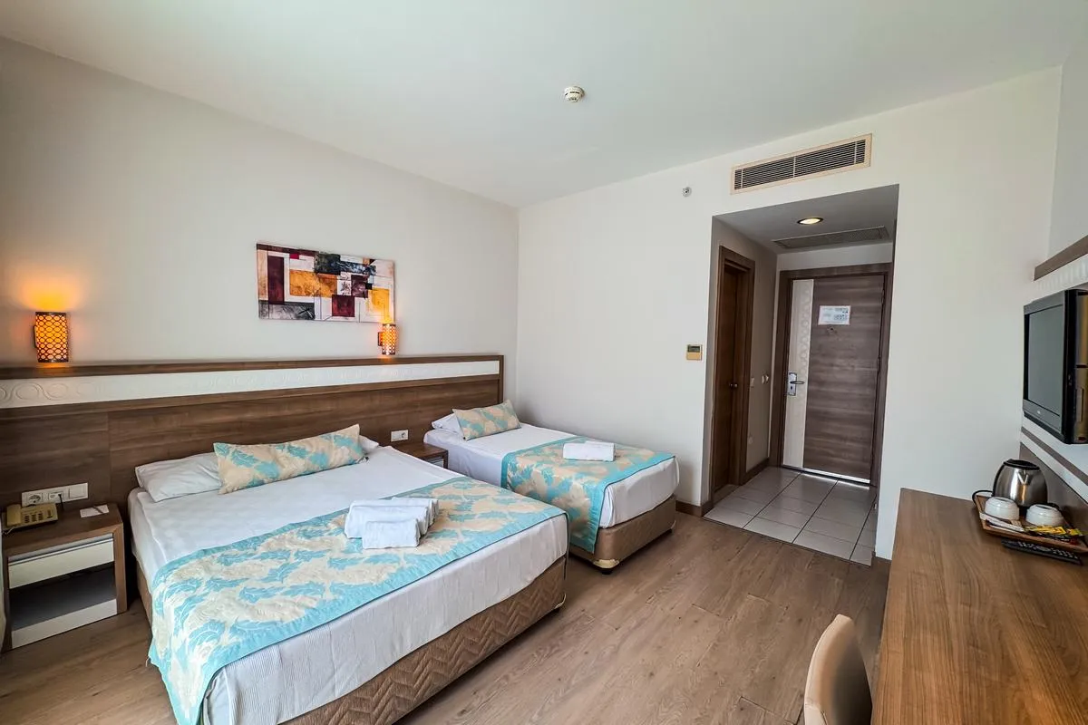Descriere generală Hotelul Merve Sun Hotel este locat la cca. 450 m de o plajă privată cu nisip. Pe plajă sunt disponibile gratuit șezlonguri și umbrele de soare. Orașul Manavgat este la aprox. 7 km (Antalya cca. 70 km). Veți găsi un supermarket la cca. 3 km. Cele mai apropiate baruri și restaurante sunt la cca. 500 m distanță. Următoarele atracții pot fi accesate de la hotel: Museum (cca. 4 km). Hotelul dispune de serviciu de rentacar. De asemenea, aveți în apropiere o stație de autobuz și o stație de taxi (cca. 50 m) cea ce vă oferă mobilitate în timpul vacanței. Aeroportul (AYT) se află la aprox. 64 km. Un serviciu de transfer (contra cost) face legătura între hotel și aeroport. Un alt aeroport (GZP) este la cca. 108 km. Până la cea mai apropiată plajă există, de asemenea, un serviciu de transfer (graduit). Facilități Încântătorul hotel dispune de 5 etaje și peste 176 camere repartizate între o clădire principală și de 5 clădiri secundare. Hotelul are recepție deschisă 24h (check-in de la 14:00, check out până la 12:00), lobby cu bar, 3 lifturi, aer condiționat, minimarket și alte magazine. Accesul la internet WiFi este disponibil gratuit pentru oaspeții hotelului. Pentru evenimente de afaceri, hotelul oferă o zonă de conferințe. Serviciul de menaj este gratuit. Spălătorie, călcat și serviciul medical sunt disponibile la un cost suplimentar. Piscină Zona exterioară a hotelului include o piscină precum și o piscină pentru copii și un tobogan de apă. Acolo sunt disponibile gratuit șezlonguri și umbrele de soare. Un bar lângă piscină oferă oaspeților băuturi răcoritoare. Catering Mic dejun (între orele 07:30 - 10:00) bufet suedez. All Inclusive: micul dejun, prânzul și cina. Micul dejun, prânzul și cina pot fi servite numai în anumite restaurante. Apă. Băutură de bun venit, mic dejun târziu (între orele 09:30 - 10:00), băuturi răcoritoare (10:00 - 00:00), cafea și ceai (10:00 - 00:00), prăjituri și produse de patiserie (16:00 - 17:00), aperitive (12:30 - 14:30), bere (10:00 - 00:00), vin (10:00 - 00:00), băuturi alcoolice naționale (10:00 - 00:00), gustări la miezul nopții (23:00 - 00:00) și internet gratuit. Sport/Leisure Este disponibil: Tenis de masă (gratuit), fitness, volei pe plajă, biliard (contra cost) și darts (gratuit). La cca. 450 m de hotel, sunt oferite sporturi nautice (unele de către furnizori locali). La cca. 2,5 km de hotel este un teren de golf. Oferte de wellness: Saună și hamam gratuite. Masaje contra cost. Divertisment pentru adulți: spectacole de seară și muzică live. Pentru distracția celor mici există un loc de joacă. Îngrijirea copiilor: mini club pentru copii (de la 4 - 12 ani) și babysitting (contra cost). Informații suplimentare Pentru anumite facilități sau activități se pot aplica taxe suplimentare. Unele servicii depind de anotimp și de condițiile climatice locale. Limbi de serviciu: engleză, germană și turcă. Carduri de credit: Visa și Euro/MasterCard. 2 Schlafzimmer Standard Familienzimmer: Dotate cu pat pentru bebeluși (gratuit), parchet laminat, minibar (posibil contra cost), balcon, acces la internet (gratuit), seif (contra cost) și TV cu ecran plat prin satelit precum și aer condiționat reglabil individual. Baie cu duș. Double Standard Zimmer: Dotate cu pat pentru bebeluși (gratuit), parchet laminat, minibar (posibil contra cost), balcon, acces la internet (gratuit), seif (contra cost) și TV cu ecran plat prin satelit precum și aer condiționat reglabil individual. Baie cu duș. Dimensiune: 20 m². Double Standard Zimmer (Economy): Cameră cu pat pentru bebeluși (gratuit), parchet laminat, minibar (posibil contra cost), balcon, acces la internet (gratuit), seif (contra cost) și TV cu ecran plat prin satelit precum și aer condiționat reglabil individual. Baie cu duș. Einzelbelegung Standard Zimmer: Cameră cu pat pentru bebeluși (gratuit), parchet laminat, minibar (posibil contra cost), balcon, acces la internet (gratuit), seif (contra cost) și TV cu ecran plat prin satelit precum și aer condiționat reglabil individual. Baie cu duș.
