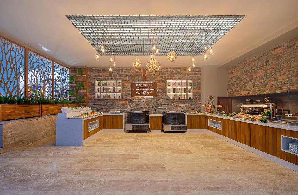 Fara plata: un restaurant principal pentru servire mic dejun,mic dejun tarziu, pranz si cina, gustare tarzie, mini bar, gustari in timpul zilei, inghetata, placinte turcesti, o data pe sejur la unul din restaurantele a la carte ( otoman si asiatic), bauturi alcoolice si nealcoolice locale si unele de import, Wifi in camere si in zonele comune, centru fitness, baie turceasca, sauna, baie cu aburi, tenis de masa, darts, aerobic, animatie si spectacole pentru copii si adulti, miniclub si facilitati pentru copii, beach party, seri tematce, restaurant pentru copii, tobogane, carucior pentru copii disponibil cu depozit, loc de joaca pentru copii