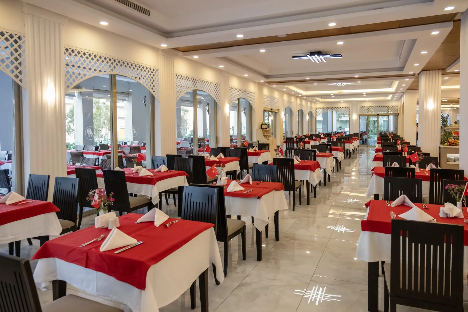 The hotel Royal Atlantis Spa & Resort Hotel is located approx. 450 m from the private beach. The old town is around 15 km away. A supermarket is around 2 km away. On the beach are cushions, sun umbrellas and beach towels available. Cold drinks are served at the bar on the beach. The hotel is equipped with a 24h reception, a lobby bar, Wi-Fi, a lift, a supermarket and other shops, a hairdresser as well as a first aid kit. In the outdoor area you will find a seasonally open pool, where sun loungers and sun umbrellas are available for free. For children there is also a children's pool. Inside the hotel you can use an indoor pool. For your entertainment, the hotel offers a disco. You can store your luggage in the hotel's storage room. To clean your clothes there is a laundry service (extra fee). For your comfort the hotel page will ensure you are looked after. The energy supply is 220 Volts. Catering Breakfast is offered from the buffet. Lunch and dinner are also served from the buffet. Your physical well-being is catered for by the pool bar. For dinner, guests are asked to wear appropriate clothing in the restaurant. Distances